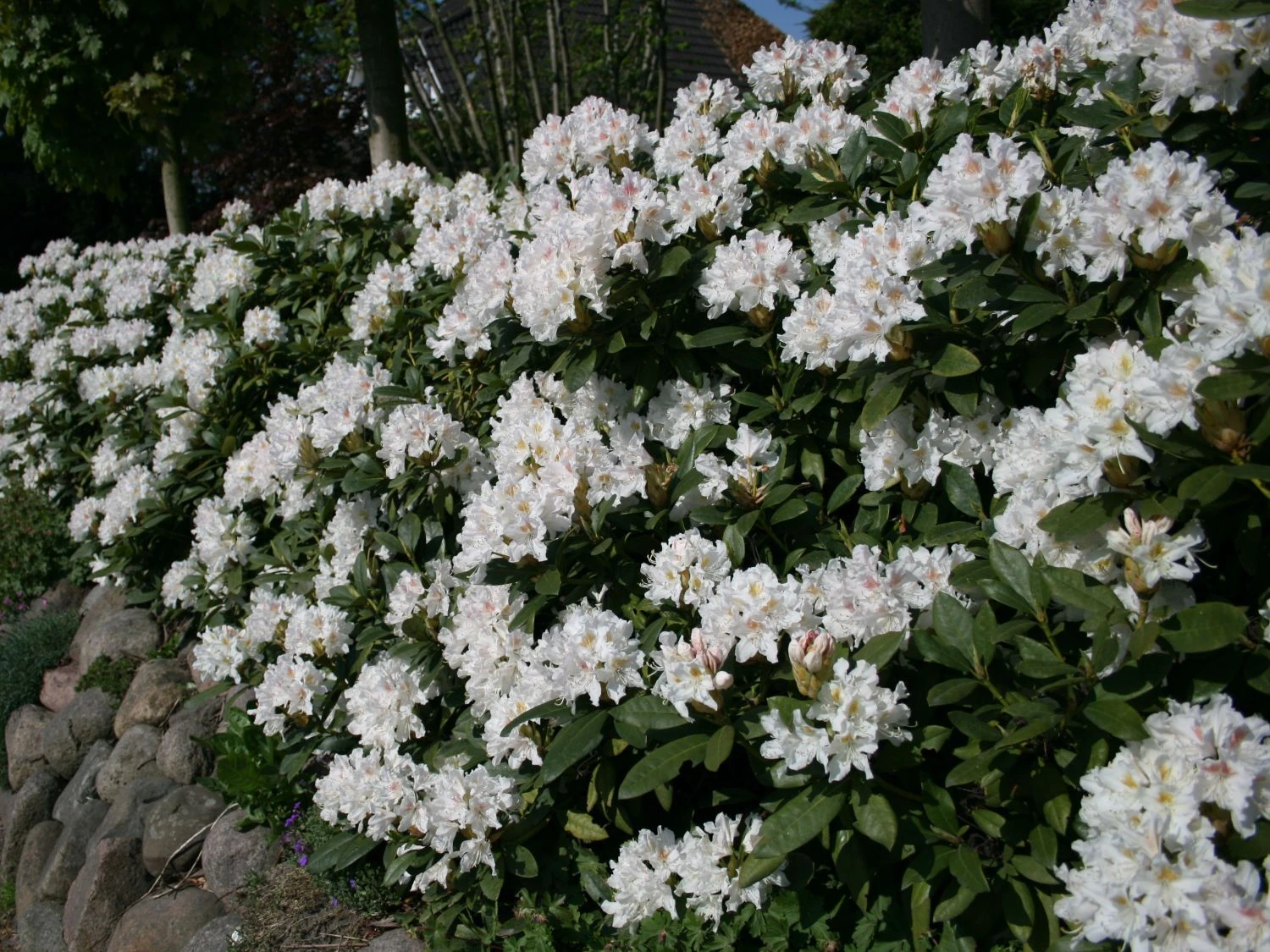 Der Rhododendron ‚Cunningham’s White‘ ist eine der bekanntesten weiß blühenden Sorten. Der wundervolle Zierstrauch ist seit den 1830er Jahren bekannt und ein Klassiker. Der großblumige (bot.) Rhododendron Hybride ‚Cunningham’s White‘ sieht zur Blütezeit nicht nur hinreißend aus, seine Blüten verströmen auch einen angenehmen Duft. ‚Cunningham’s White‘ ist eine flachkugelige Sorte. Der Rhododendron wächst dichtbuschig und besonders kompakt. Der immergrüne Strauch erreicht nach Jahren eine maximale Wuchshöhe von gut 4 Metern und eine Breite von guten 2 Metern. Der Jahreszuwachs liegt im Durchschnitt bei 10 bis 20 Zentimetern. Die strahlend weißen Blüten entwickeln sich Ende April aus rosa Knospen. Die Blütezeit dauert bis Ende Mai. Die weißen Blüten des Rhododendrons ‚Cunningham’s White‘ weisen eine zartgelbe Zeichnung auf. Das dunkelgrüne Laub bildet einen fantastischen Hintergrund für die weiße Blütenpracht. Die Blätter sind oval und glänzend. Ihre Textur ist ledrig und der Blattrand ist leicht gewellt. Der immergrüne Strauch ist eine beliebte Heckenpflanze. Vor allem auf großen Grundstücken oder in Parks ist das Erscheinungsbild dieses Rhododendrons prachtvoll. Als Solitär entwickelt ‚Cunningham’s White‘ einen runden, harmonischen Wuchs. Die Pflanze eignet sich mit ihrem flachen Wurzelsystem auch zum Unterpflanzen unter tiefwurzelnde Bäume.