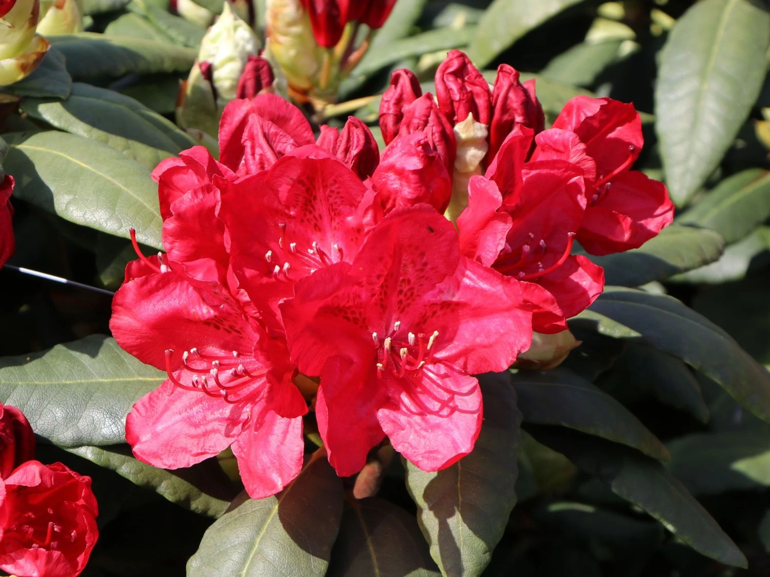 Rhododendron ‚Hachmann’s Feuerschein‘ – Als kleiner, immergrüner, breitbuschig wachsender Strauch erreicht er eine Höhe von ca. 1,4 m und hat einen Jahreszuwachs von ca. 10 cm.