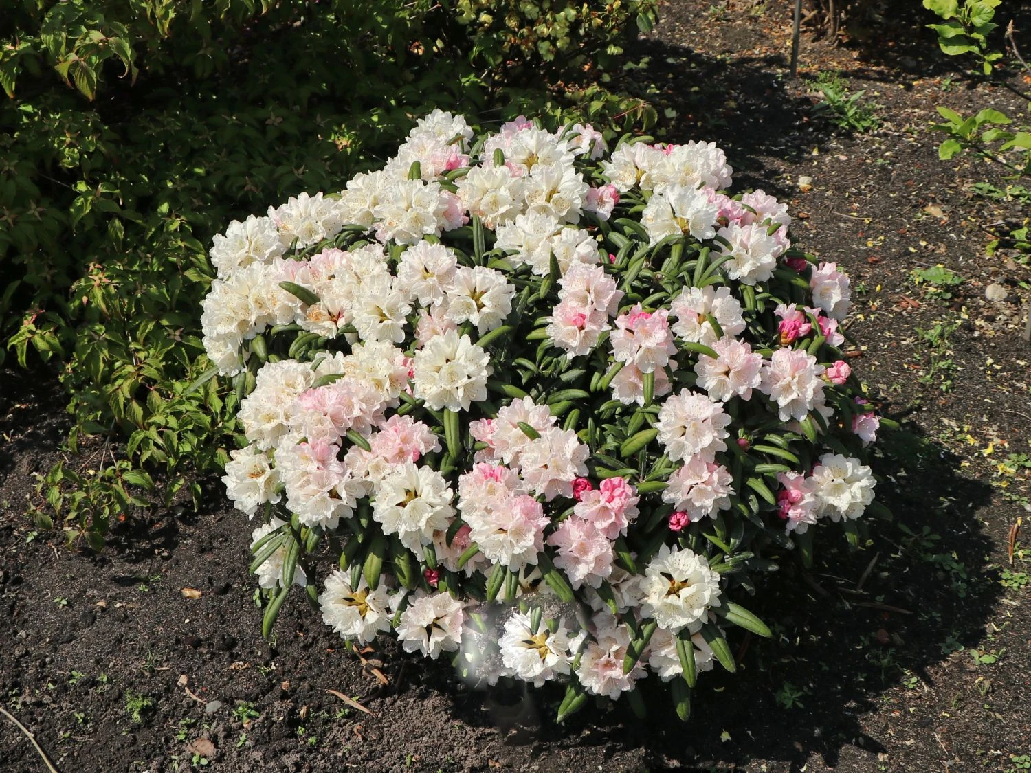 Rhododendron ‚Makiyak‘ – Eine kleine goldbraune Zeichnung verziert die rosaweißen trichterförmigen Blüten dieses Rhododendrons. Sie erreichen einen Durchmesser von 4,5 cm.