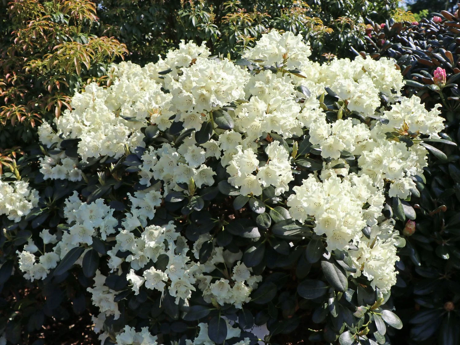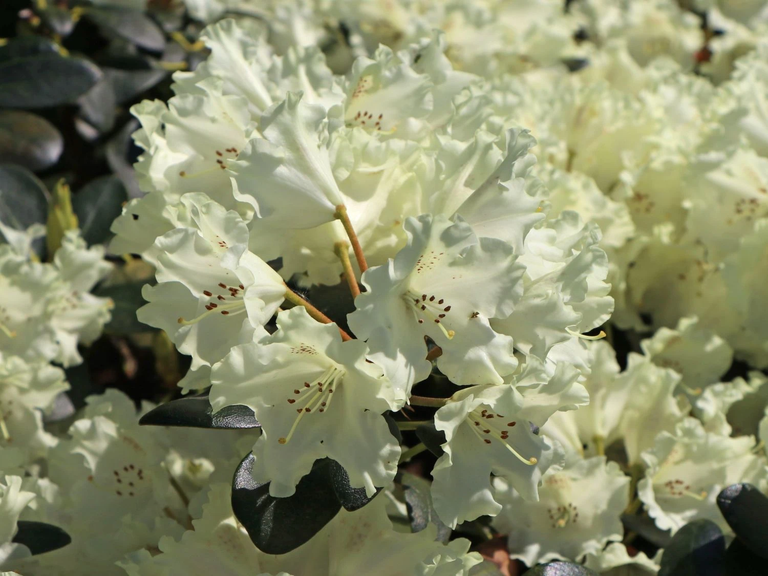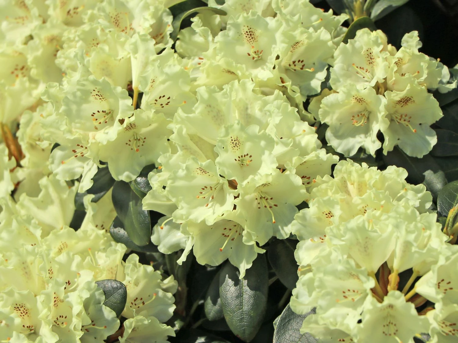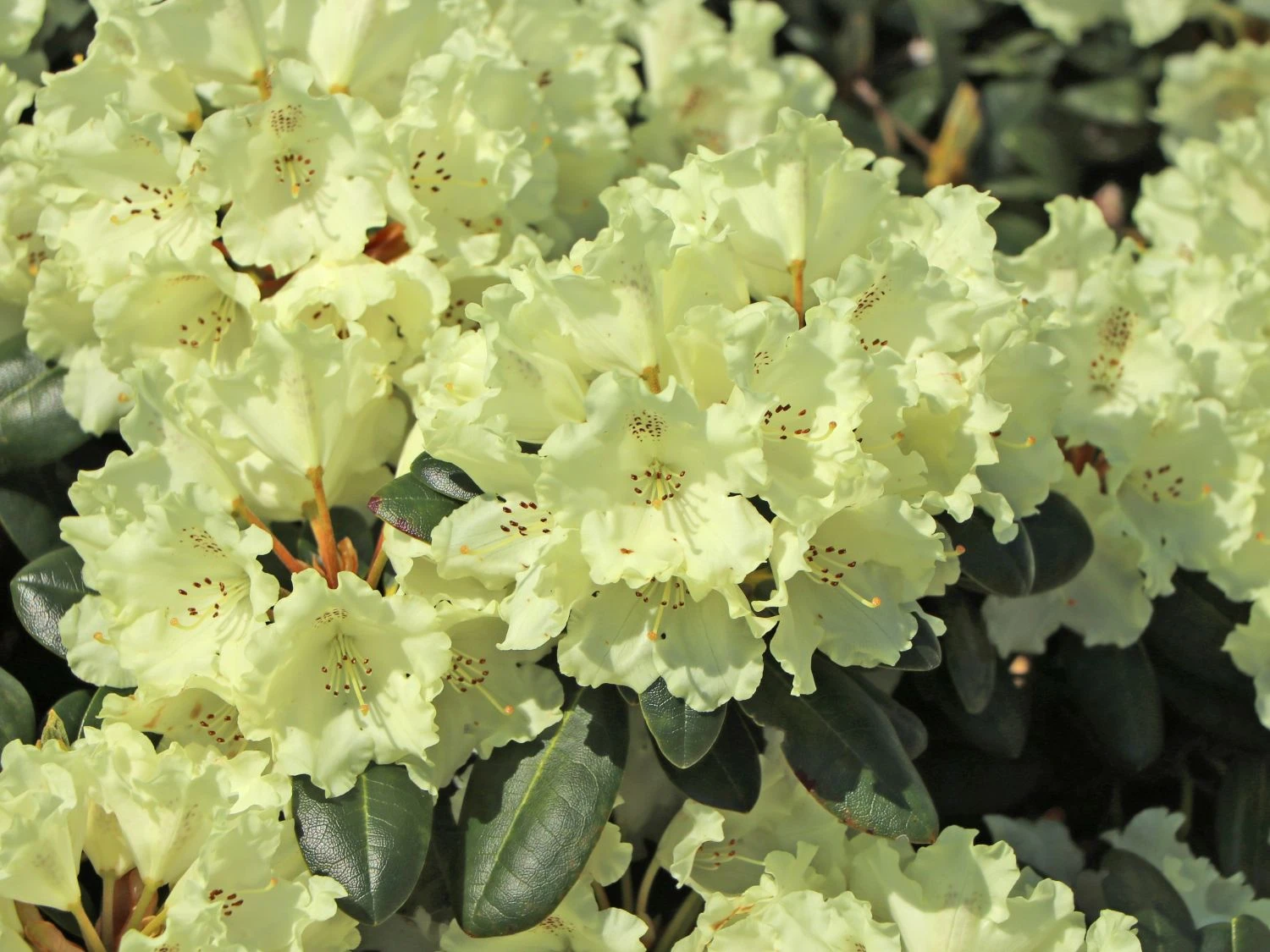 Rhododendron ‚Marietta‘ – Zu seinen sehr hellgelben Blütenblättern paßt die goldbraune Zeichnung optimal. Die Blütensäume sind formschön gewellt. Ab einer Größe von 30 cm ist dieser Rhododendron sehr reich blühend.