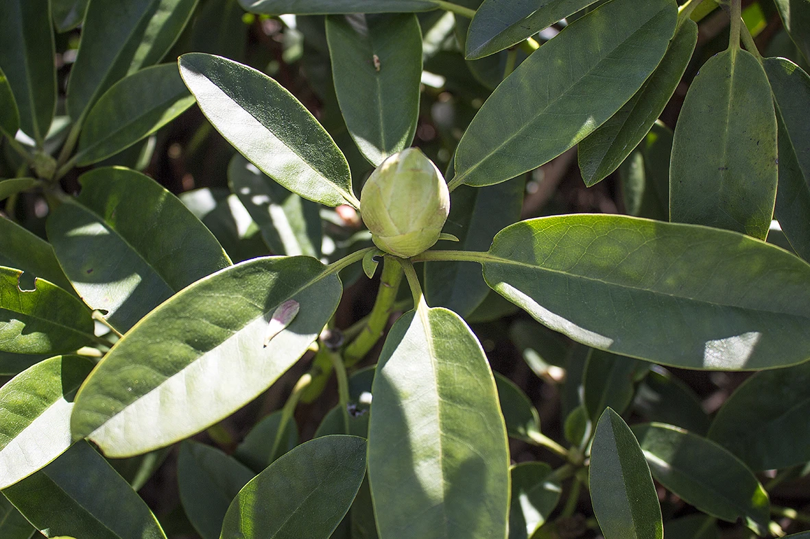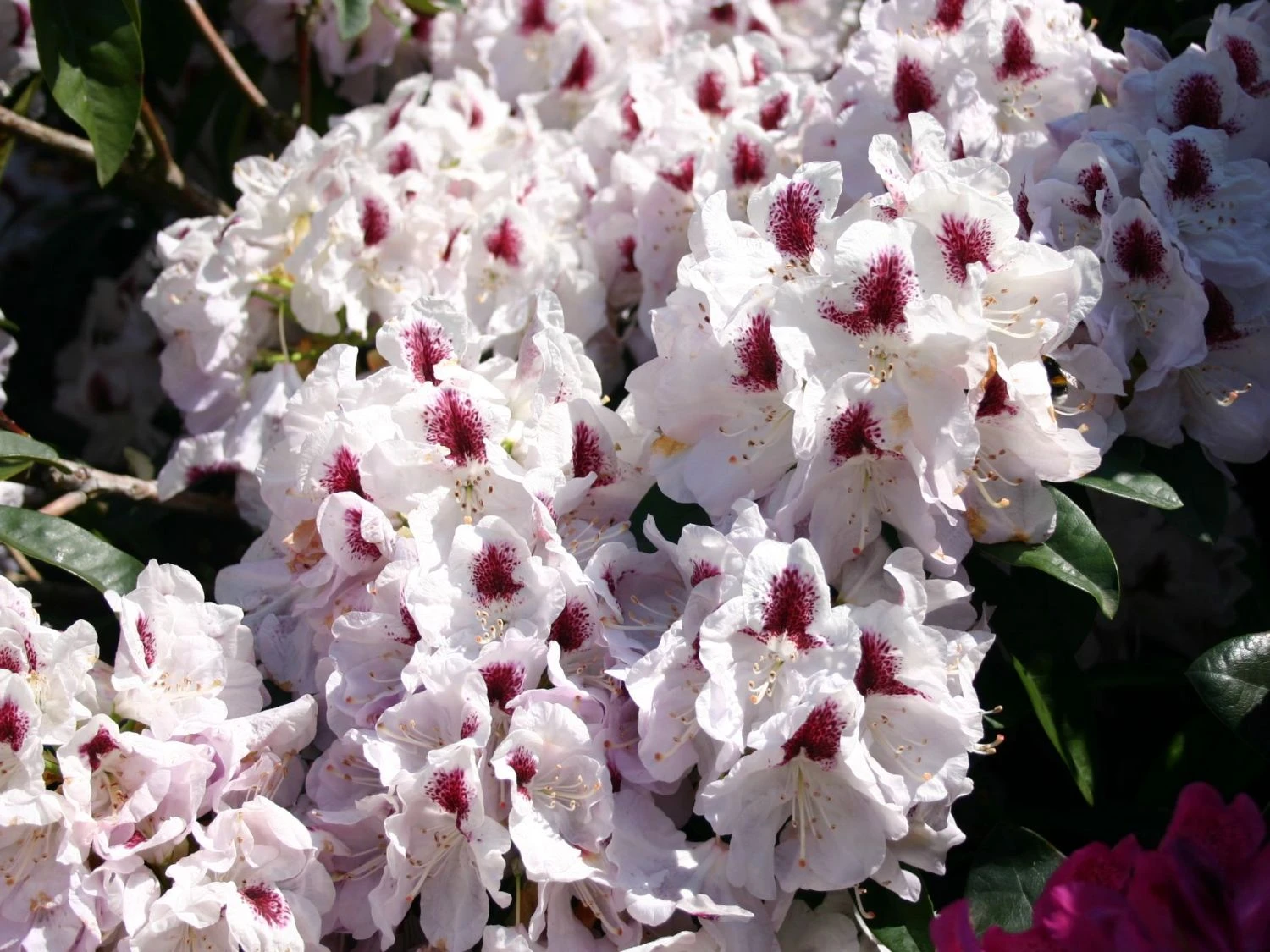 Der Rhododendron ‚Marsalla‘ ist eine fast reinweiße Züchtung, deren Blütenblätter einen leichten fliederfarbenen Überzug aufweisen. Auf dem oberen Kronblatt prangt eine wunderschön schwarzrote Fleckzeichnung, die sich auf die benachbarten Blütenblätter ausdehnt. Die Säume sind leicht gekräustelt.