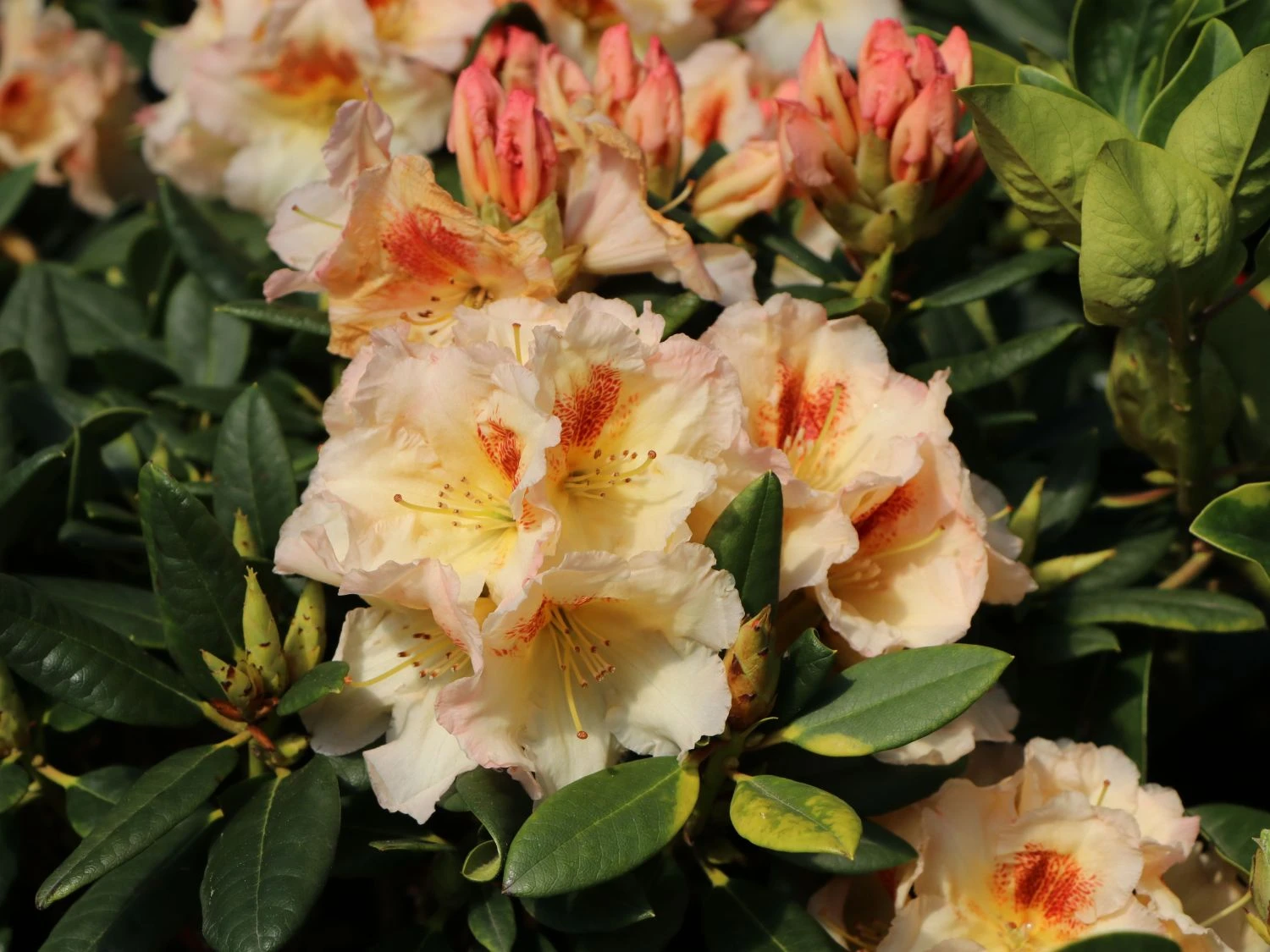 Der Rhododendron ‚Marylou‘ ist eine farblich eher dezentere Sorte. Ihre Blüten sind innen und außen cremegelb, die gewellten Ränder scheinen leicht rosa überstäubt. Auf den oberen Kronblättern zeigt sich effektvoll eine orangerote Zeichnung.