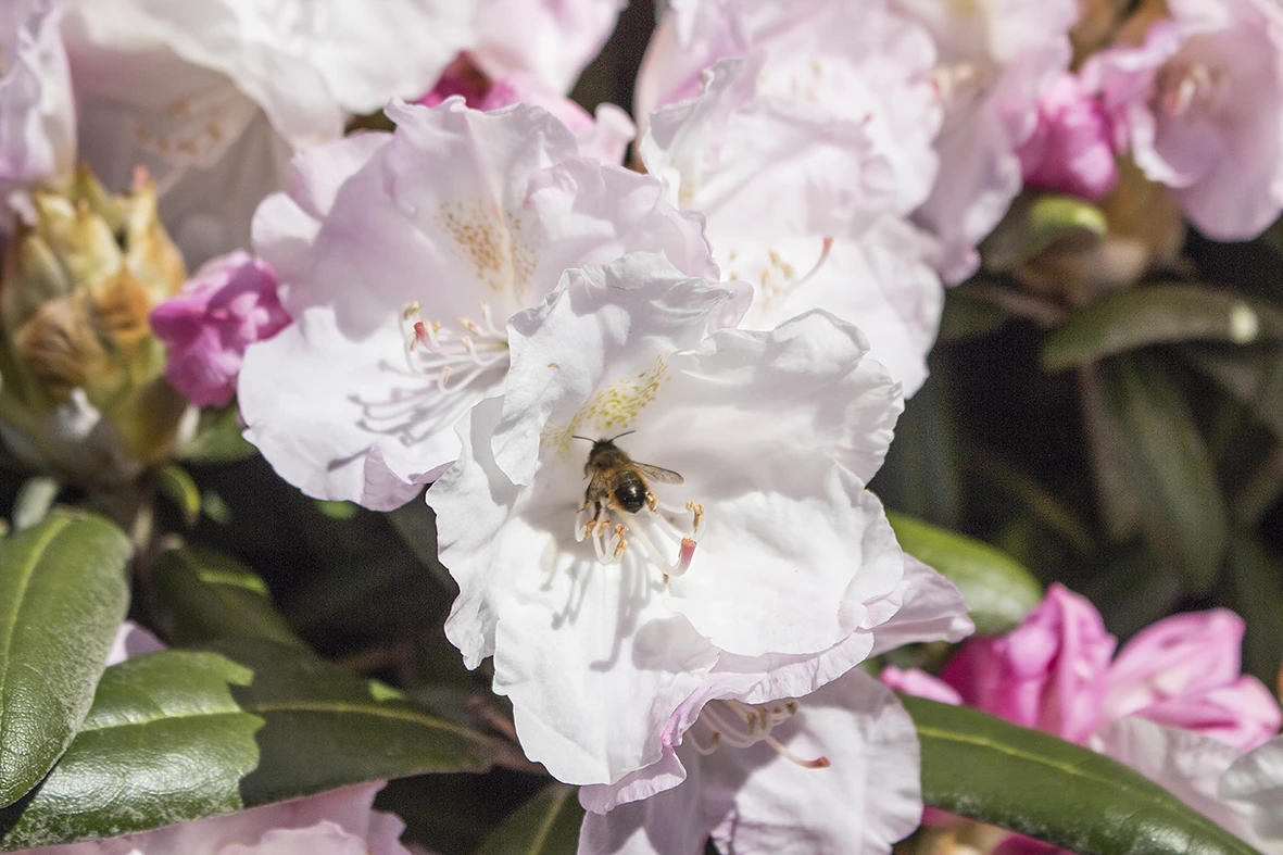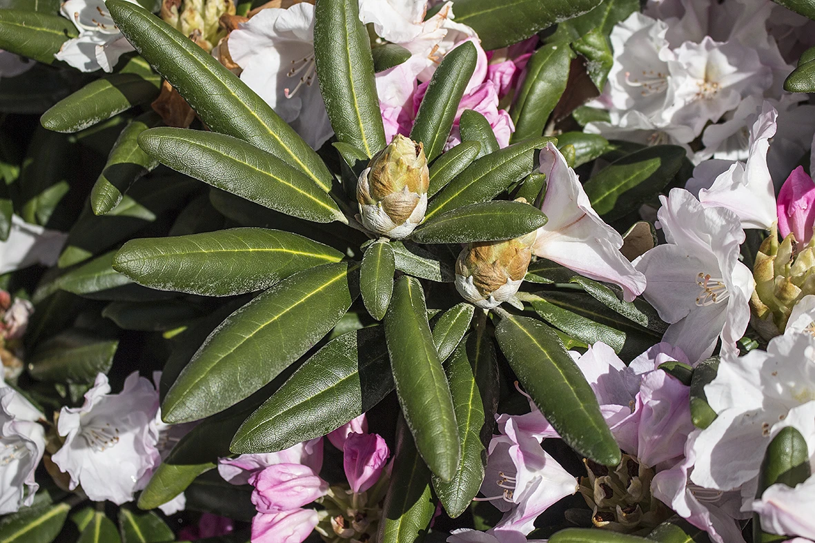 Rhododendron ‚Mist Maiden‘ – Das ‚Schleiermädchen‘ wie der Name übersetzt heißt, kleidet sich in ein weißes Blütenkleid, welches im Aufblühen noch zartlila ist. Auf dem oberen Kronblatt trägt die große, offene Blüte eine gelbgrüne Zeichnung. Bereits als recht junge Pflanze ist diese Sorte sehr reich blühend.