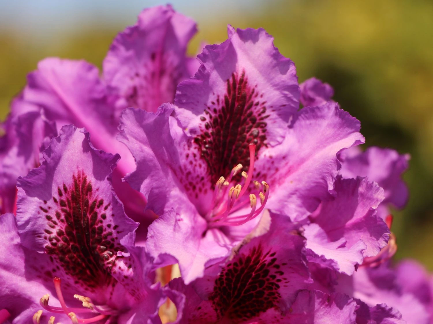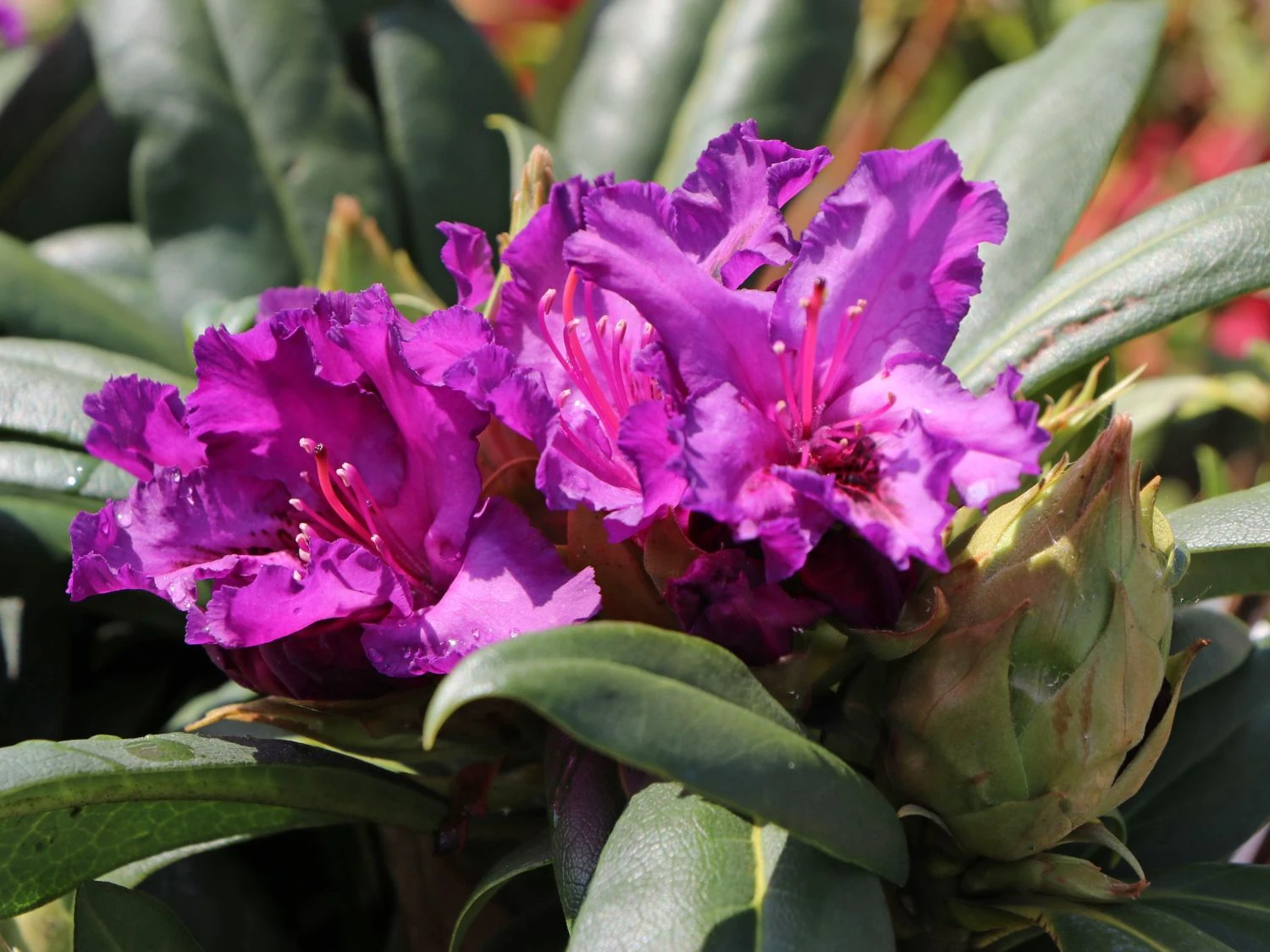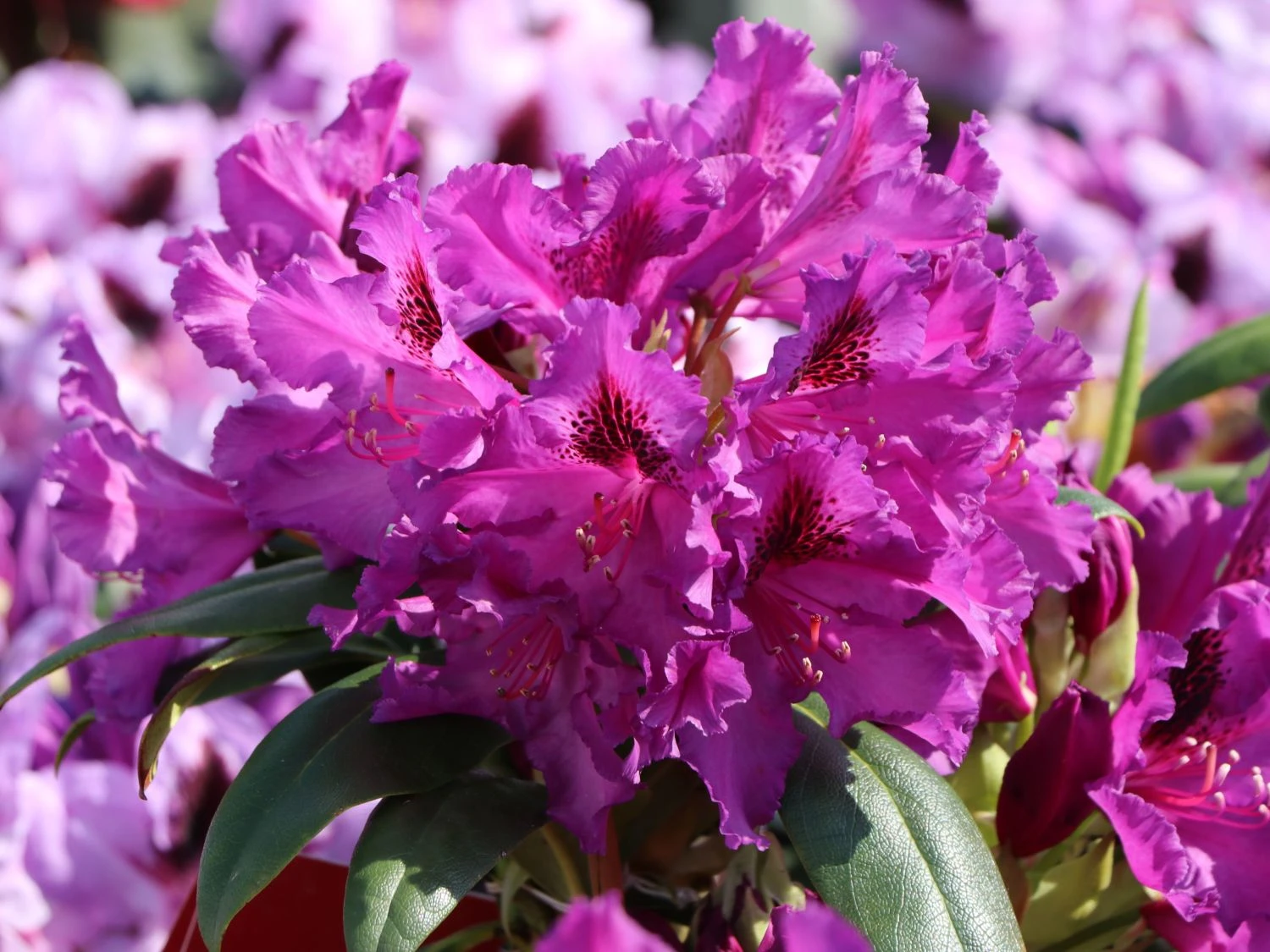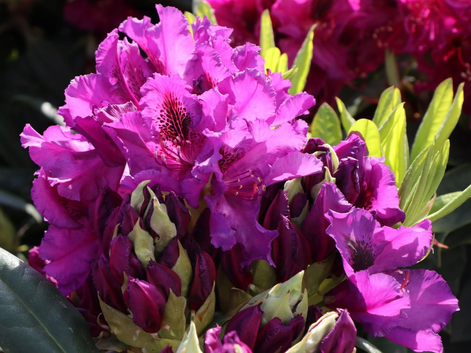 Der Rhododendron ‚Mogambo‘ ist eine der attraktivsten violett blühenden Sorten. Die Blüten sind an den Säumen adrett gewellt und zeigen weit geöffnet eine brombeerschwarze Fleckzeichnung, zu der die weißen Pollensäcke großartig passen.