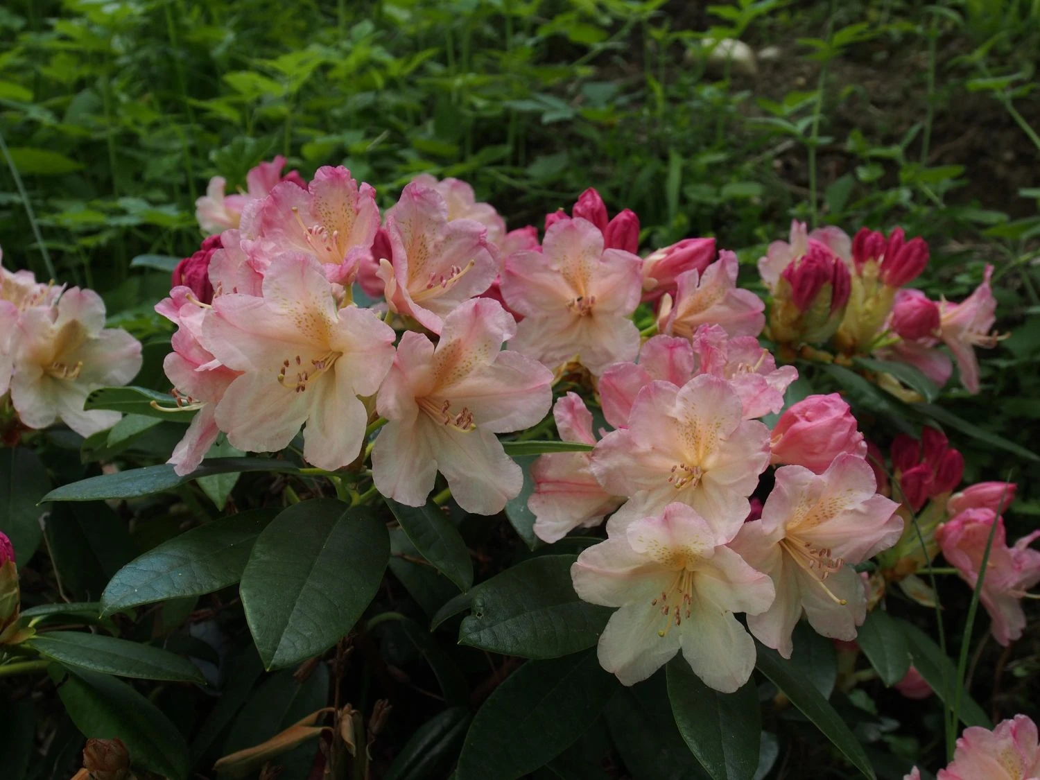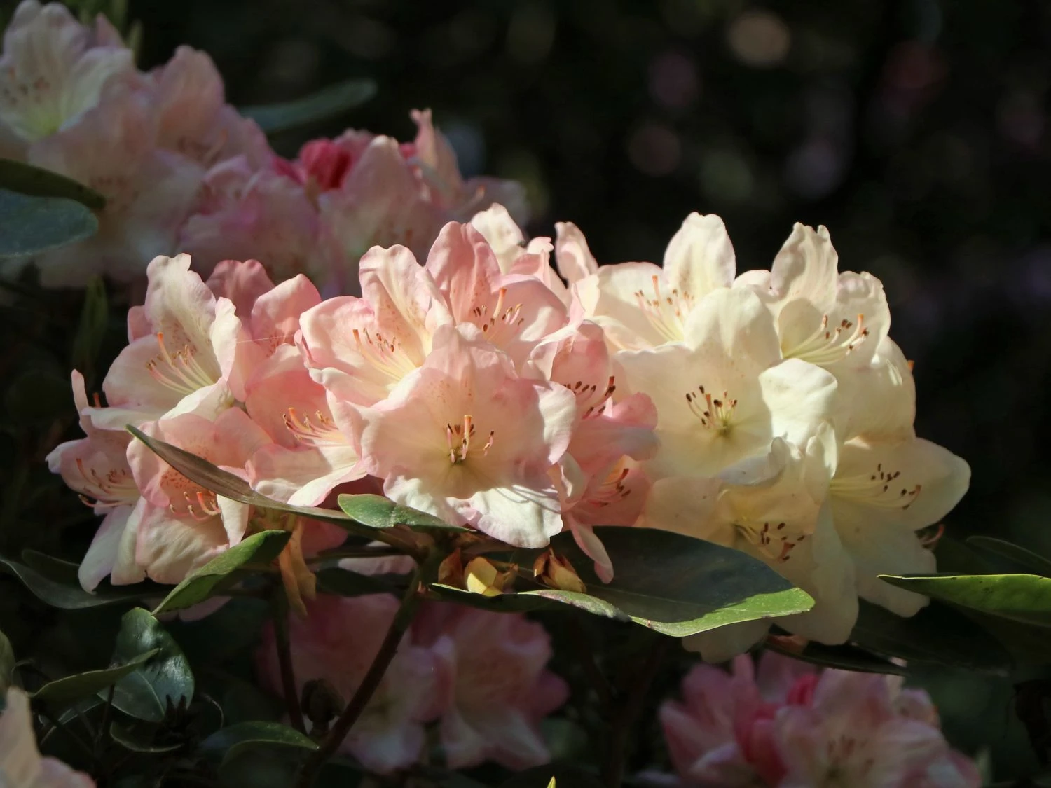 Rhododendron ‚Percy Wiseman‘ – Diese Sorte schmückt sich mit zuerst hellgelben Blüten, die später einen rosigen Touch bekommen. Im Verblühen zeigen sie sich eher zartgelb. Innen tragen Sie eine kleine hellbraune Zeichnung.