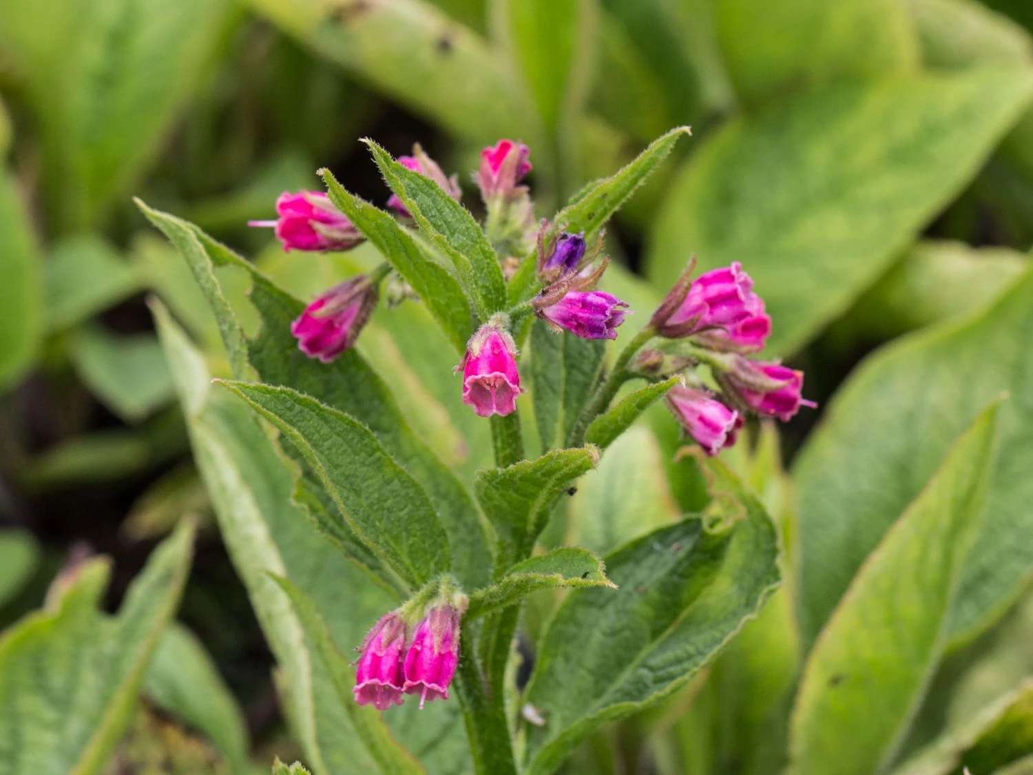 Das wunderschöne und zugleich kräftige Dunkelrot der Blüten ist ein Blickfang im Garten. Trotz der niedrigen Wuchshöhe, zieht die Blüte dieser Staude alle Blicke auf sich. Besonders’bei einer Bepflanzung in der Gruppe. Durchdachte Kombinationen sorgen für einen zusätzlichen Deko-Faktor im Beet. Mit Stauden, die im leuchtenden hellblau, weiß oder gelb blühen, entwickeln sich die schönsten Nachbarschaften. Dieser Anblick verzaubert und ist der reinste Augenschmaus. Die einfachen Blüten setzen sich in einem wickeltraubigen Blütenstand zusammen. Die Blütenform ist als röhrenförmig zu beschreiben. Die Knospen der Blüte sitzen überhängend und in Gruppen zusammen. Sehr dunkel wirken sie im geschlossenen Zustand. Das Laubwerk der Symphytum rubrum bildet mit seinem wunderschönen Dunkelgrün einen reizvollen Kontrast. Die Blätter sind breitlanzettlich geformt. Einen großen Pflegeaufwand erwartet die Symphytum rubrum nicht. Abgeblühte Blütenstände und -stängel schneidet der Gärtner bis zu den oberen Stängelblättern zurück. Die Staude zieht sich über die winterliche Zeit in ihren Wurzelballen zurück. Daraus treibt der Rote Beinwell ab Frühjahr kräftig, und jedes Jahr üppiger als im Vorjahr aus.