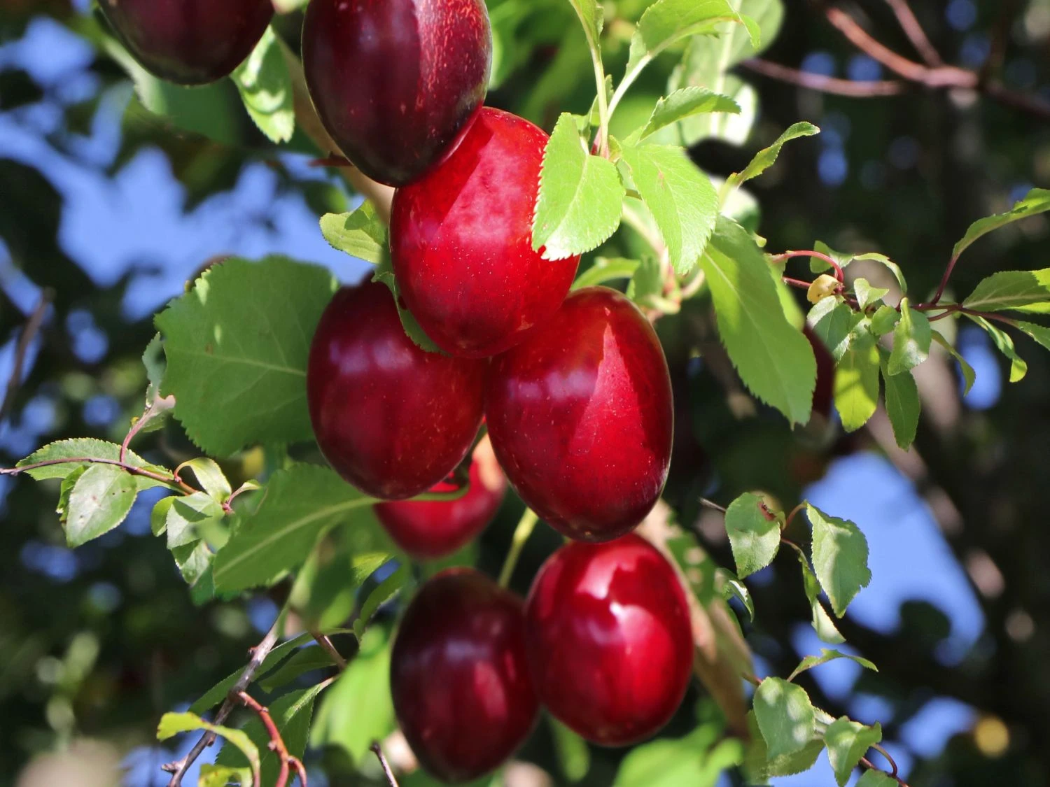 Die Säulen-Mirabelle ‚Ruby‘ verzaubert mit ihren herrlichen Früchten, die unwiderstehlich süß schmecken und sich vielseitig verwenden lassen. In einem appetitlichen Kirschrot funkeln die großen Früchte zwischen dem sattgrünen Laub hervor. Unter ihrer Schale verbirgt sich köstliches rotes Fruchtfleisch, das erfrischend saftig ist. Diese schöne Pflanze trägt frühe und hohe Erträge. Da (bot.) Prunus domestica subsp. syriaca ‚Ruby‘ ein kleinbleibendes, schmales Obstgehölz ist, passt sie wunderbar in kleinere Gärten. Auch auf dem Balkon und der Terrasse ist sie ein wunderschöner Blickfang mit ihrem schlanken Wuchs. Niemand ohne eigenen Garten muss auf das köstliche Obst verzichten! Ihre schlanke, säulenförmige Wuchsform verleiht der Säulen-Mirabelle ‚Ruby‘ ein ansprechendes Erscheinungsbild. Das Säulenobst erreicht eine Wuchshöhe zwischen 200 und 300 cm und eine Wuchsbreite von 50 bis 100 cm. Die Mirabelle wächst straff aufrecht, kompakt und dicht verzweigt. Von April bis Mai ist sie von einem zarten Blütenflor übersät. Die kleinen Blüten schimmern in einem anmutigen Weiß. Sie verströmen einen wunderbaren Duft und locken Scharen von Bienen, Hummeln und anderen Insekten an. Mit der bienenfreundlichen Pflanze sorgt der Gärtner für einen belebten Garten. Aus den Blüten bilden sich im Laufe des Sommers die schmackhaften Früchte, die ab August erntereif sind. Ihre Schale zeigt sich zur Erntezeit kirschrot gefärbt und leicht bereift. Auch das Fruchtfleisch ist rot. Die Früchte sind sehr groß und oval geformt.