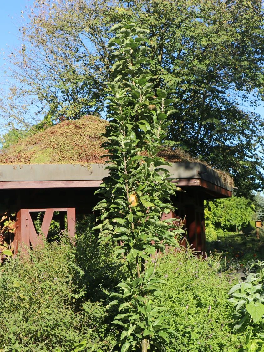 Für einen höheren Ertrag ist es ratsam, einen zweiten Apfelbaum in die Nähe des Malus ‚Arbat‘ ® zu pflanzen. Als Befruchter eignen sich alle gängigen Apfelsorten. Auch alle anderen Säulenäpfel, wie beispielsweise ‚Golden Gate‘ (S) oder ‚Silver Pearl‘ sind geeignet. Der Wuchs dieses Gehölzes macht seinem Namen alle Ehre. Schlank und säulenförmig wächst der Apfelbaum auf eine Höhe von zwei bis drei Metern und erreicht einen Durchmesser von circa 50 Zentimetern. Damit ist der Säulenapfel ‚Arbat‘ ® ein auffällig schmales Gehölz, dass Standorte abseits des klassischen Obstgartens ziert. Ein sonniges Plätzchen auf der Terrasse genügt dem Apfelbaum. In einem großen Pflanzgefäß wächst er dort prächtig heran und ist ein ungewöhnlicher Anblick. Während der Blütezeit im Frühling lässt sich diese attraktive Pflanze bewundern. Vom liebsten Sitzplatz, mit einem Stück Apfelkuchen, lassen sich die schöne Wuchsform und die heranreifenden Früchte ausgiebig betrachten. Im Garten empfiehlt sich das Gehölz beispielsweise für Innenhöfe, nahe Eingängen oder im Vorgarten. Als zierlicher Solitär schmückt das Bäumchen kleine Gärten und wirkt als Teil einer Gehölzgruppe apart. Diese Sorte des Säulenapfels hat ihre Heimat in Russland. Entsprechend zeigt er sich robust in unseren Wintern und gibt sich in allen Belangen widerstandsfähig. Schorf, Mehltau und Rost befallen ihn in der Regel nicht. Frostige Temperaturen von bis zu rund -29 Grad Celsius fügen der Pflanze keinen Schaden zu. Gegenüber dem Boden zeigt sich Malus ‚Arbat‘ ® anspruchslos. Am wohlsten fühlt er sich in frischen und humusreichen Gartenböden. Sie sind idealerweise durchlässig, damit die Wurzeln keinen Schaden nehmen. Junge Exemplare gießt der Gärtner nach dem Anpflanzen regelmäßig. Nach einigen Standjahren ist eine solche Pflege ausschließlich während langer Trockenperioden notwendig. Natürlich brauchen Kübelpflanzen regelmäßig Gießwasser. Allgemein zählt der Säulenapfel ‚Arbat‘ ® zu den pflegeleichtesten Apfelbäumen. Der Gärtner schneidet ihn nicht zurück. Lediglich ein Auslichten ist erforderlich. Dann bilden sich schöne große Früchte, die ausreichend Licht erhalten um ihr süßes Aroma zu entwickeln.