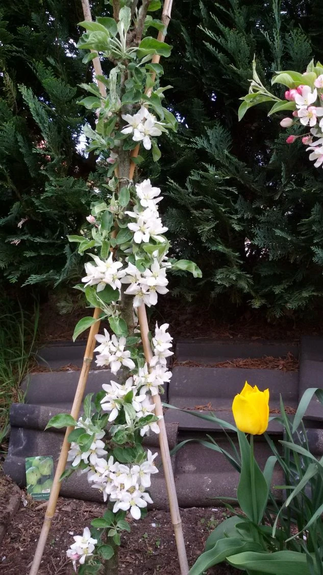 Ende April bilden sich an den seitlichen Triebspitzen des Säulenapfels Ballerina ‚Bolero‘ ® zahlreiche rosa Knospen. Die weißen Blüten sitzen in Büscheln zwischen dem dichten Blattwerk. Den Ertrag steigert eine andere Befruchtersorte in der Nähe. Ein Säulenapfel einer anderen Sorte direkt neben den Malus Ballerina ‚Bolero‘ ® platziert, löst das Problem. Bienen und Hummeln lieben Apfelblüten und tragen die Pollen von Baum zu Baum. Der Säulenapfel Ballerina ‚Bolero‘ ® fühlt sich in einem großen Kübel wohl. Hier kann er fünf Jahre wachsen. Äpfel lieben einen humusreichen, durchlässigen Boden, der einen guten Wasserabzug bietet. Gerade in den Sommermonaten, wenn die Äpfel reifen, benötigt ein Säulenapfel in einer Kübelkultur viel zusätzliches Wasser. Wegen geringen Blattmasse ist eine ausreichende Zufuhr von Nährstoffen wichtig. Dem Gießwasser alle zwei Wochen Flüssigdünger beizugeben, bewirkt wahre Wunder.