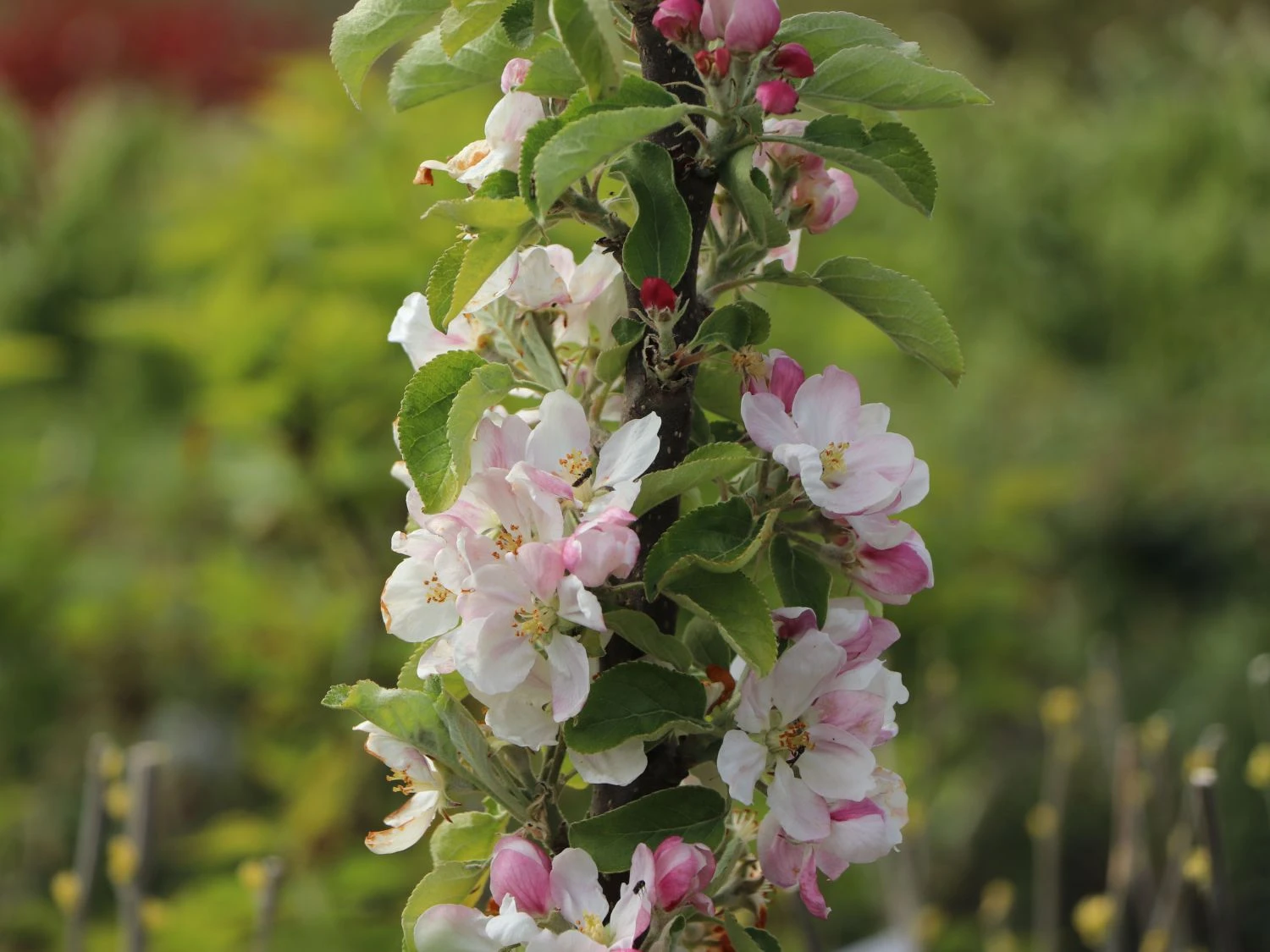 Die Früchte des Säulenapfels Campanilo ® quattro sind köstlich und bergen ihren herrlich süß-säuerlichen Geschmack unter ihrer roten Schale. Die Äpfel entstehen aus den hellrosa Blüten, die ab April blühen und in dieser Zeit für Bienen, Hummeln und eine Vielzahl anderer Insekten eine begehrte Nahrungsquelle darstellen. Ab September sind die Äpfel von Malus domestica Campanilo (R) quattro