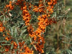 Etwas mehr Beachtung benötigt jedoch die Jungpflanze, da diese zunächst einmal den guten Start in ein langes Leben erhalten muss. Dazu gehört die gute Wässerung bei Frischpflanzung, sowie ein ggf. leichter Winterschutz in Form von Reisig oder Tannenzweigen im ersten Standjahr. Die angewachsene Pflanze bedarf in den Folgejahren keiner weiteren Schutzmaßnahmen im Winter. Unser Tipp: Auf Rindenmulch sollte verzichtet werden, da dieser bei der Pflanze erfahrungsgemäß zu einem Kümmerwuchs führen könnte. Der Sanddorn bildet Ausläufer. Dies ist bei der Bepflanzung an Wegrändern zu beachten, denn die starken, oberflächlichen Wurzeln besitzen die Kraft, Wegplatten und Steine mit der Zeit anzuheben. Eine weitere wichtige, positive Eigenschaft ist die sehr vitaminreiche, gesunde und dekorative Frucht des Sanddorn ‚Vitaminhochzeit‘ (m / w). Hippophae rhamnoides ‚Vitaminhochzeit‘ trägt wahrlich einen leuchtenden Fruchtschmuck in orange. Dieser lässt sich während der Fruchtphase bereits aus der Ferne betrachten und bestaunen. Eine einzelne Frucht misst in etwa 6 bis 8 Millimeter im Durchmesser. Die zahlreich vorkommenden Früchte sitzen dicht an dicht in großen Trauben. Zu dem kräftigen Silber-Grün der Blätter ist es ein eindrucksvoller Kontrast. Gleichzeitig ist das Blatt ein schöner Schmuck für das Auge. Das Laubwerk wirft der Sanddorn ‚Vitaminhochzeit‘ (m / w) über die kalte Jahreszeit ab. Die Blüte des Sanddorns ‚Vitaminhochzeit‘ wird zwar als unscheinbar bezeichnet, setzt mit ihren bräunlichen bis grünlichen Farbnuancen attraktive Akzente. Die Blütezeit ist von März bis April. Folglich bilden sich nach dem Verblühen die saftig leuchtenden Früchte. Ideal ist für das Laubgehölz ein sonniger Standort. Bei der Auswahl des Bodens zeigt sich wieder der geringe Anspruch der Pflanze. Hippophae rhamnoides ‚Vitaminhochzeit‘ gedeiht sowohl auf feuchten Böden, wie auf sandigen Untergründen. Die Pflanze bevorzugt jedoch den kalkhaltigen und lockeren Boden.