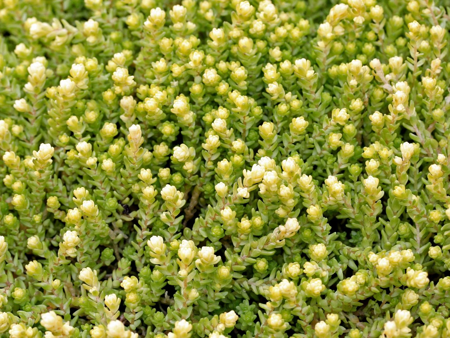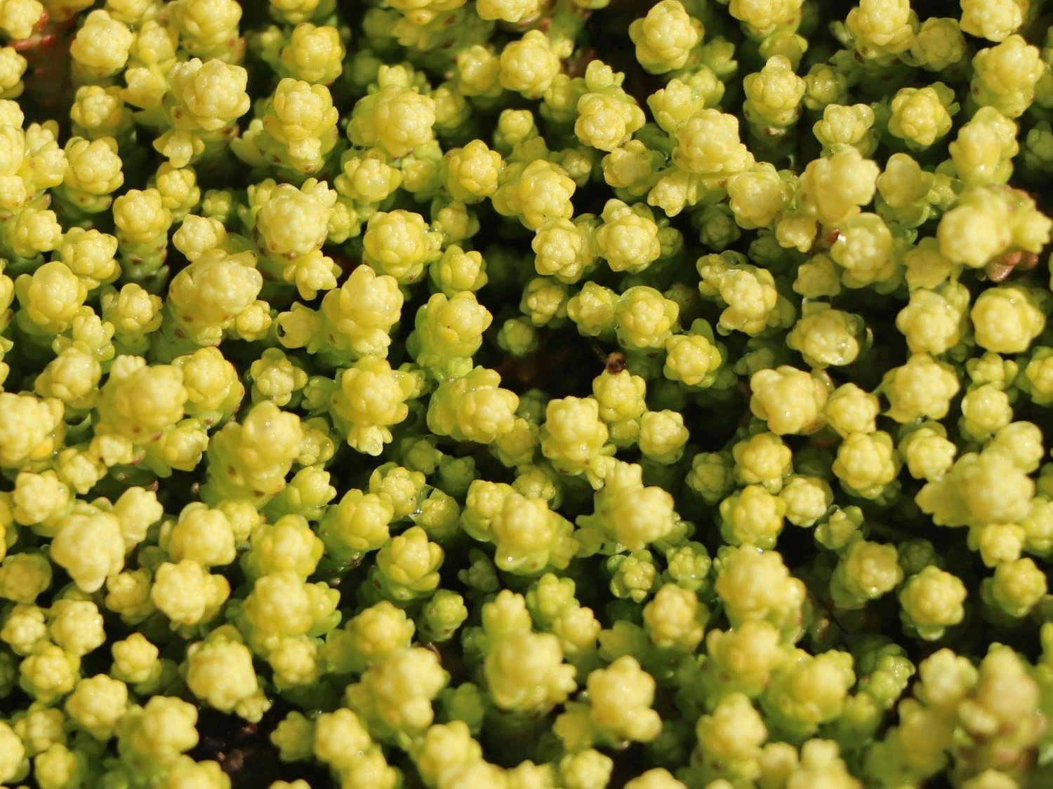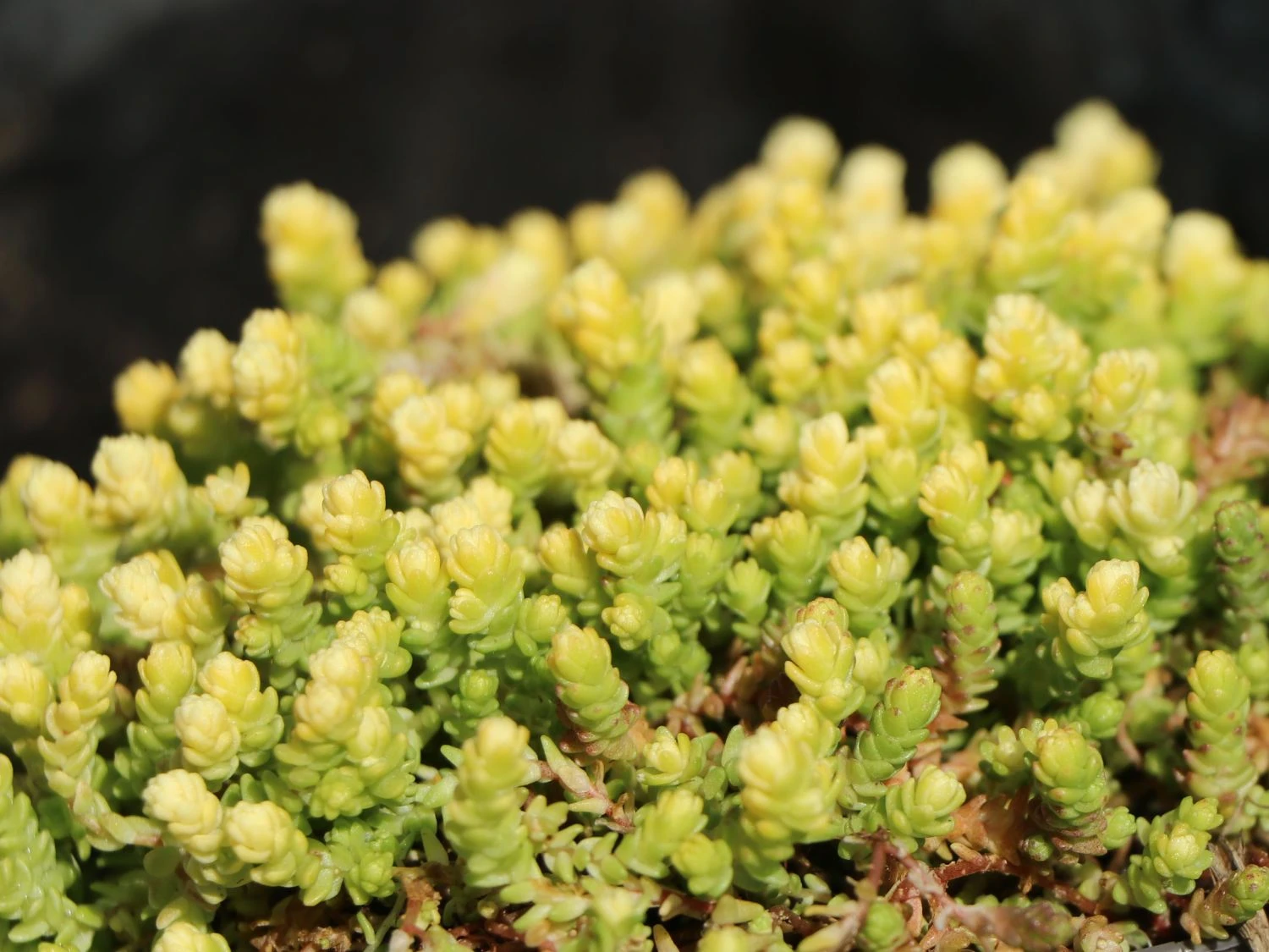 Scharfer Mauerpfeffer ‚Yellow Queen‘ ist ein reizender Bodendecker, der mit seinem reichen Flor und dem immergrünen Laub erfreut. Im Garten und auf dem Balkon bietet er eine Vielzahl von Verwendungen. Er ist robust und stellt geringe Pflegeansprüche. Winzige, dicht angeordnete Blättchen bedecken das ganze Jahr über weite Flächen im Garten. Sie schimmern in einem lichten Grüngelb. Im Winter und zeitigen Frühjahr setzen ihre hellgelben Blattspitzen märchenhafte Akzente. Ein Meer von goldgelben Blütensternen schmückt die Staude in den Sommermonaten. Dank des kriechenden, bodendeckenden Wuchses bildet Sedum acre ‚Yellow Queen‘ dichte, üppige Teppiche. Die kleinwüchsige Staude erreicht 5 bis 10 Zentimeter in der Höhe und 10 bis 20 Zentimeter im Durchmesser. Ihre immergrünen Blätter sind eiförmig, vorn zugespitzt, auffallend klein und weisen eine matte Oberfläche auf. Sie sind sukkulent, das bedeutet weich, fleischig und saftreich. Herrlich intensiv ist das Wirken in den Wintermonaten mit ihren leuchtend gelben Spitzen. Später verwandelt sich ihr Farbton in ein sattes Grüngelb. Im Sommer ziehen die Blätter ein. Von Juni bis Juli ist Scharfer Mauerpfeffer ‚Yellow Queen‘ von goldgelben, doldenförmig angeordneten Blüten übersät, welche die gesamte Staude bedecken. Die Blüten sind klein und sternförmig. Da ihr Nektar leicht zugänglich ist, sind sie eine beliebte Nahrungsquelle für Bienen und andere nützliche Insekten.