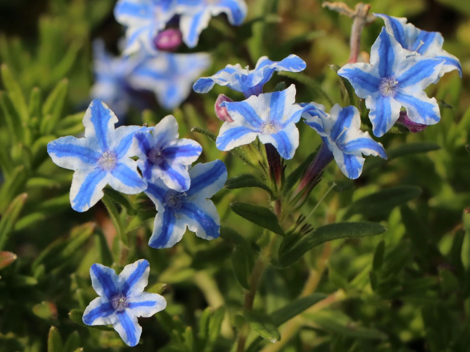Der niedrig wachsende Schein-Steinsame / Lithodora ‚Star‘ bringt Leben in jeden Steingarten. Die verholzende Staude ist unkompliziert und stellt geringe Ansprüche an ihren Standort. Diese Pflanze genießt in der Sonne ein glückliches Leben. Auch Trockenheit verträgt die Staude gut. Von Mai bis in den Juli und erfreut (bot.) Lithodora diffusa ‚Star‘ den Gärtner mit dichten, hübschen Blütenpolstern. Diese niedrig wachsende Staude kommt auf eine maximale Höhe von 10 bis 15 cm und zeigt sich bis zu 20 cm breit. Die Pflanze schmückt mit ihren zweifarbigen Blüten Steingärten, Staudenbeete und Pflanzschalen. Auch als praktischer Beeteinfasser ist diese ausdauernde Pflanze geeignet.