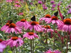 Der Scheinsonnenhut ‚Purple Prairie‘ wächst aufrecht und bis zu einen Meter in die Höhe. Ihre farbenprächtigen Blüten bildet die mehrjährige Staude ab dem ersten Standjahr aus. Zum Winter hin sterben die über der Erde liegenden Teile der Pflanze ab. Ein Rückschnitt der oberirdischen Pflanzenteile bis auf den Bodenstand ist ratsam. So treibt Echinacea purpurea ‚Purple Prairie‘ im Frühling kraftvoll neu aus. Dieses robuste Gewächs zeichnet sich durch eine gute Winterhärte aus und übersteht Temperaturen bis -17°C ohne Schaden zu nehmen. Eine dünne Schicht Mulch hilft beim Überwintern. Der langlebige Scheinsonnenhut ‚Purple Prairie‘ bringt Jahr um Jahr Freude. Ihren leuchtend pinken Blütenzauber präsentiert Echinacea purpurea ‚Purple Prairie‘ stolz von Juli bis September. Wer Wert auf einen insektenfreundlichen Garten legt, trifft mit dieser entzückenden Staude die richtige Wahl. Schmetterlinge und Bienen lieben den Scheinsonnenhut ‚Purple Prairie‘ und lassen sich gerne auf den Blüten nieder. Auffallende Farbtupfer setzt die einnehmende Zierpflanze in Blumenrabatten oder Beeten. Herrlich zu kombinieren ist Echinacea purpurea ‚Purple Prairie‘ mit anderen Sorten des vielseitigen Scheinsonnenhuts, beispielsweise in strahlendem Weiß oder hellem Rosa. Hier lässt sich nach Herzenslust mit verschiedenen Höhen oder Blütenformen spielen. Zwischen Ziergräser gepflanzt, hebt die Staude sich verlockend hervor.