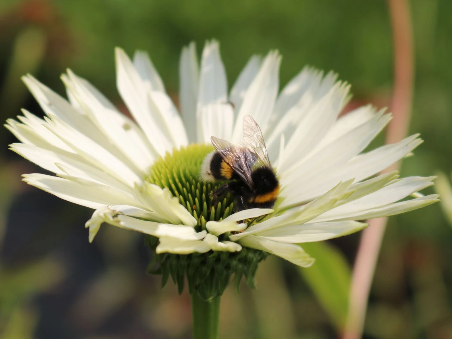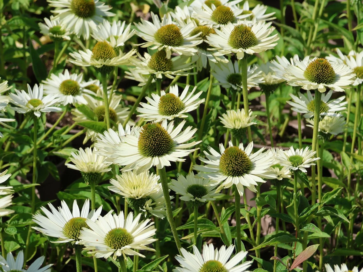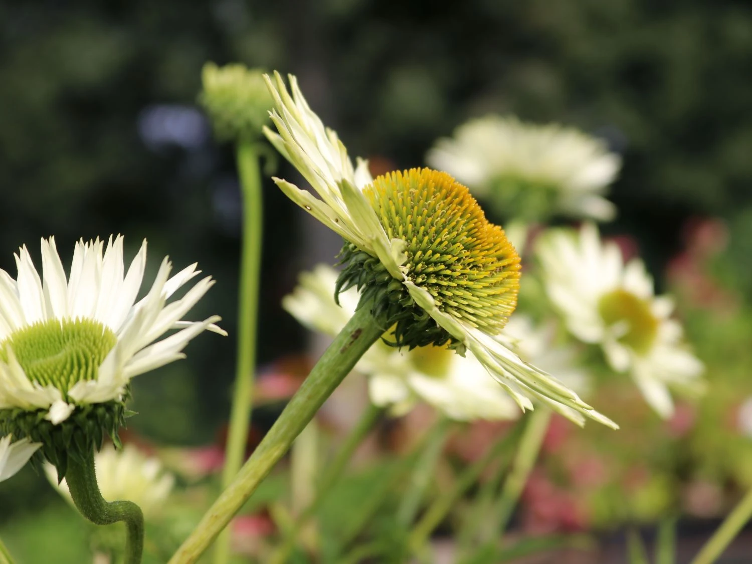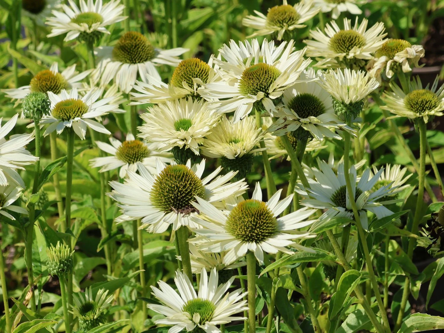 Besonders beeindruckend sind die Blüten des Scheinsonnenhuts ‚Virgin‘. Diese sind doppelreihig, körbchenartig und gefranst. In der Mitte erscheinen die waagerecht stehenden Blütenköpfe grün, während die Blütenblätter sich in makellosem Weiß präsentieren. Es entstehen beeindruckende Strahlenkränze, ein beliebter Treffpunkt für Schmetterlinge, Hummeln und Bienen. Die sommergrünen Blätter der Echinacea purpurea ‚Virgin‘ sind dunkelgrün gefärbt und lanzettlich. Sie besitzen eine matte Oberfläche und machen die robuste Staude abseits der Blütezeit attraktiv. Der ideale Standort der Pflanze ist sonnig, bei regelmäßigen Wassergaben. Sind die Wurzeln tief vorgedrungen, übersteht der Scheinsonnenhut ‚Virgin‘ Trockenperioden ohne Schaden zu nehmen. An den Boden stellt die Zierpflanze nicht viele Ansprüche. Sie wächst in durchlässigem und humosem Gartenboden. Das Gewächs fühlt sich auch in Gruppen gepflanzt wohl und verschönert größere Bereiche im Garten. Echinacea purpurea ‚Virgin‘ besitzt eine einzigartige, elegante Ausstrahlung. Zusammen mit ihrem robusten Charakter wertet sie den Garten auf und verlangt wenig Gegenleistung.