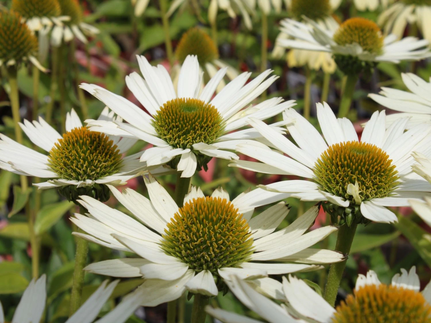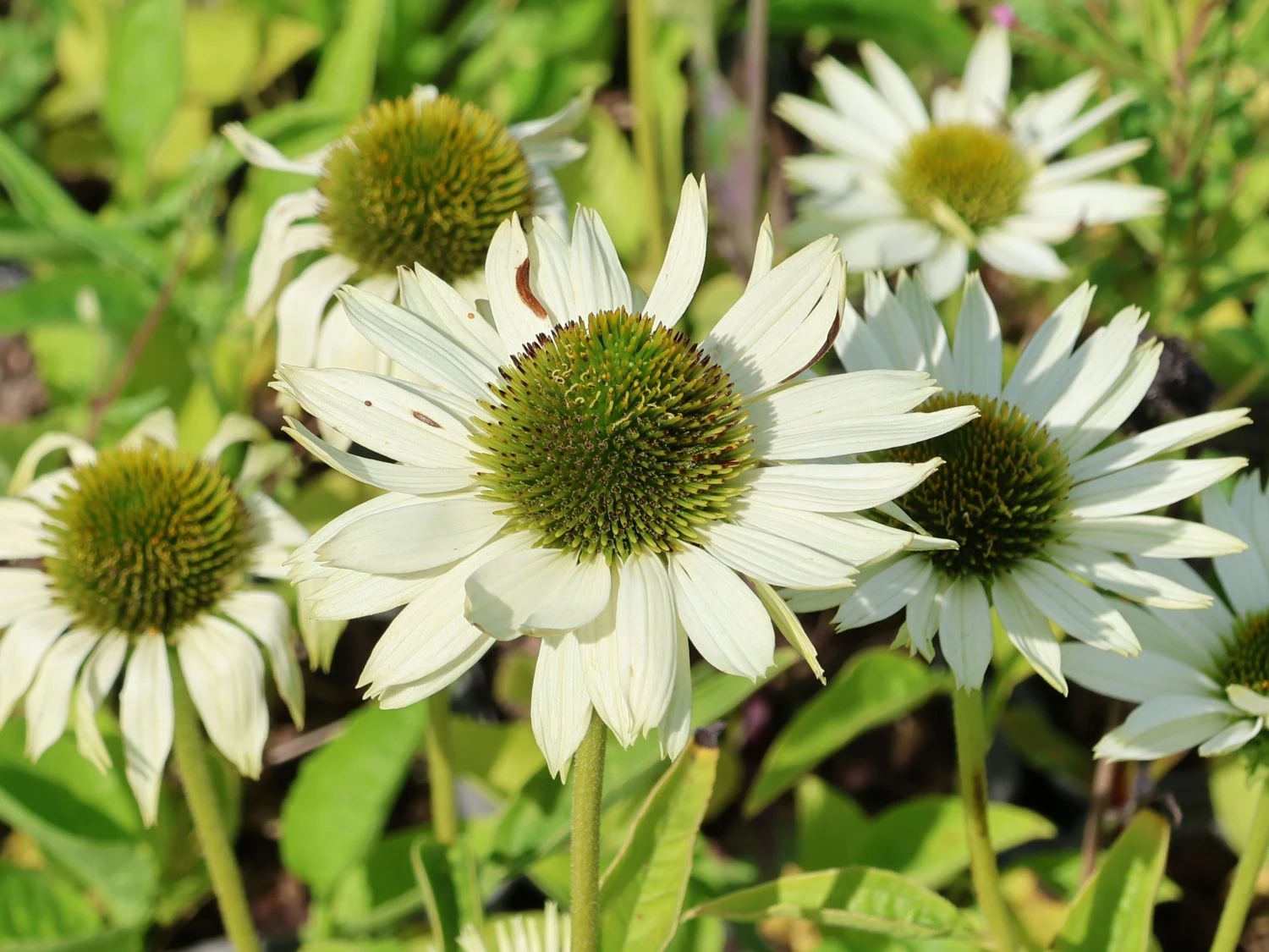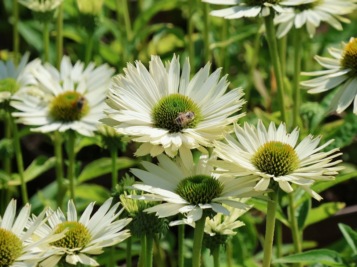 Besonders beeindruckend sind die Blüten des Scheinsonnenhuts ‚Virgin‘. Diese sind doppelreihig, körbchenartig und gefranst. In der Mitte erscheinen die waagerecht stehenden Blütenköpfe grün, während die Blütenblätter sich in makellosem Weiß präsentieren. Es entstehen beeindruckende Strahlenkränze, ein beliebter Treffpunkt für Schmetterlinge, Hummeln und Bienen. Die sommergrünen Blätter der Echinacea purpurea ‚Virgin‘ sind dunkelgrün gefärbt und lanzettlich. Sie besitzen eine matte Oberfläche und machen die robuste Staude abseits der Blütezeit attraktiv. Der ideale Standort der Pflanze ist sonnig, bei regelmäßigen Wassergaben. Sind die Wurzeln tief vorgedrungen, übersteht der Scheinsonnenhut ‚Virgin‘ Trockenperioden ohne Schaden zu nehmen. An den Boden stellt die Zierpflanze nicht viele Ansprüche. Sie wächst in durchlässigem und humosem Gartenboden. Das Gewächs fühlt sich auch in Gruppen gepflanzt wohl und verschönert größere Bereiche im Garten. Echinacea purpurea ‚Virgin‘ besitzt eine einzigartige, elegante Ausstrahlung. Zusammen mit ihrem robusten Charakter wertet sie den Garten auf und verlangt wenig Gegenleistung.