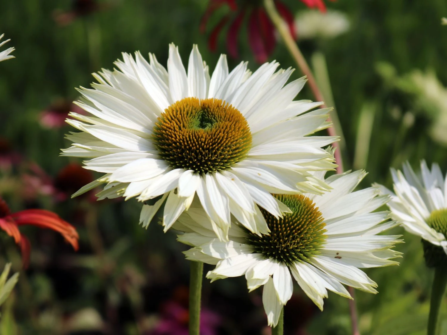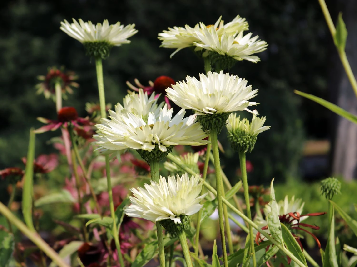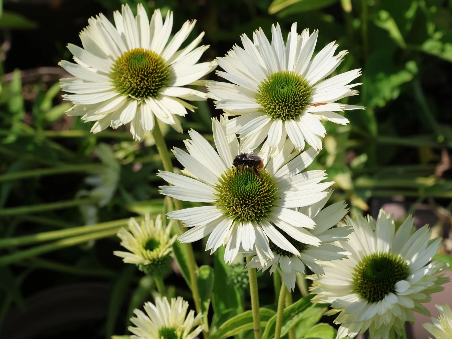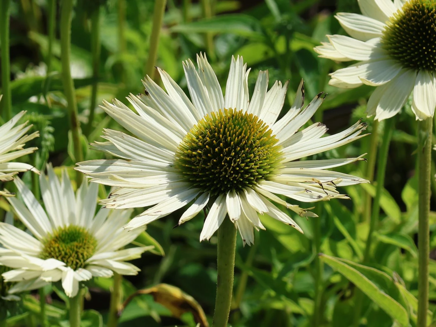 Besonders beeindruckend sind die Blüten des Scheinsonnenhuts ‚Virgin‘. Diese sind doppelreihig, körbchenartig und gefranst. In der Mitte erscheinen die waagerecht stehenden Blütenköpfe grün, während die Blütenblätter sich in makellosem Weiß präsentieren. Es entstehen beeindruckende Strahlenkränze, ein beliebter Treffpunkt für Schmetterlinge, Hummeln und Bienen. Die sommergrünen Blätter der Echinacea purpurea ‚Virgin‘ sind dunkelgrün gefärbt und lanzettlich. Sie besitzen eine matte Oberfläche und machen die robuste Staude abseits der Blütezeit attraktiv. Der ideale Standort der Pflanze ist sonnig, bei regelmäßigen Wassergaben. Sind die Wurzeln tief vorgedrungen, übersteht der Scheinsonnenhut ‚Virgin‘ Trockenperioden ohne Schaden zu nehmen. An den Boden stellt die Zierpflanze nicht viele Ansprüche. Sie wächst in durchlässigem und humosem Gartenboden. Das Gewächs fühlt sich auch in Gruppen gepflanzt wohl und verschönert größere Bereiche im Garten. Echinacea purpurea ‚Virgin‘ besitzt eine einzigartige, elegante Ausstrahlung. Zusammen mit ihrem robusten Charakter wertet sie den Garten auf und verlangt wenig Gegenleistung.