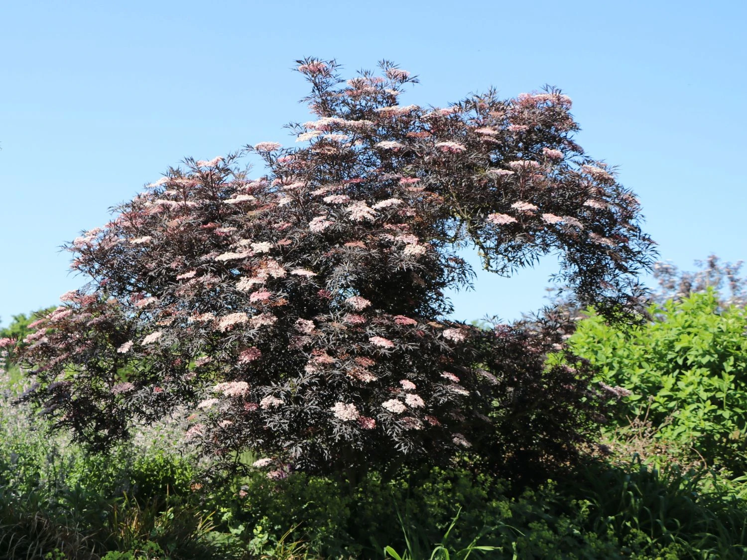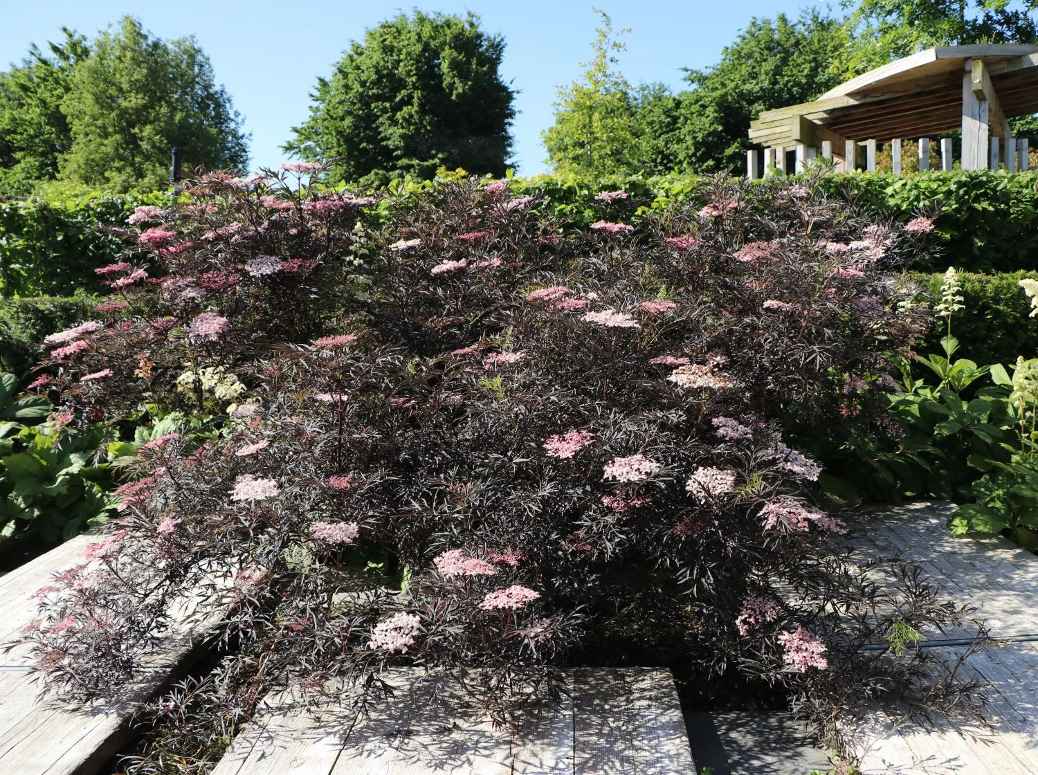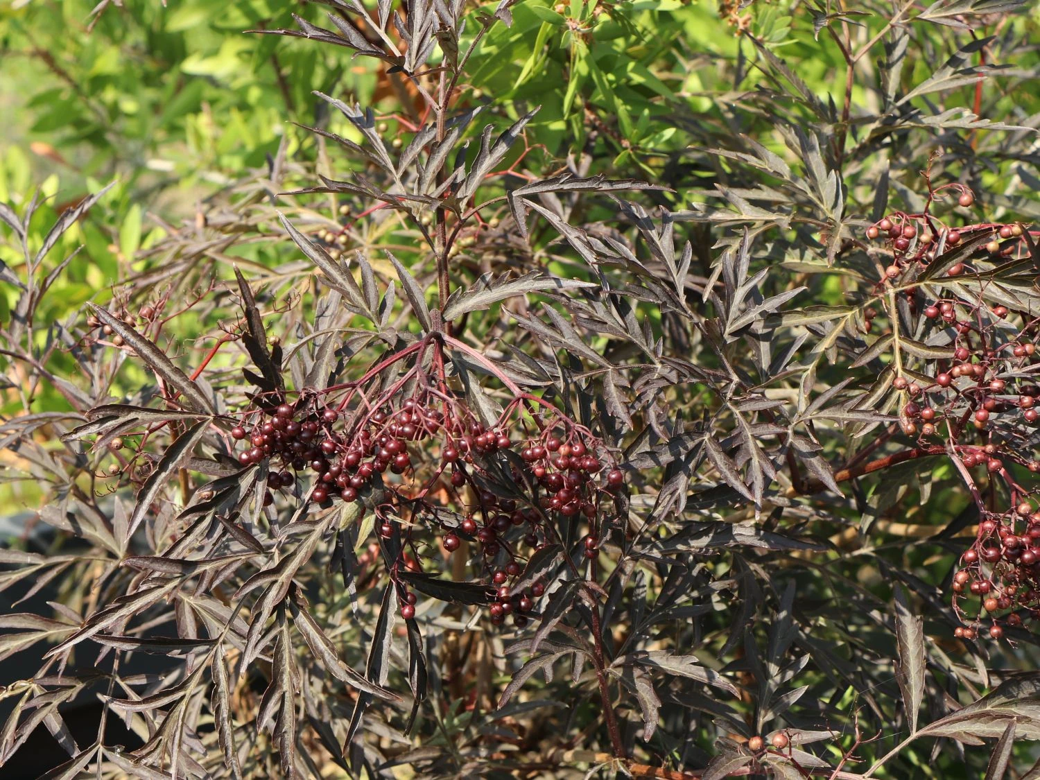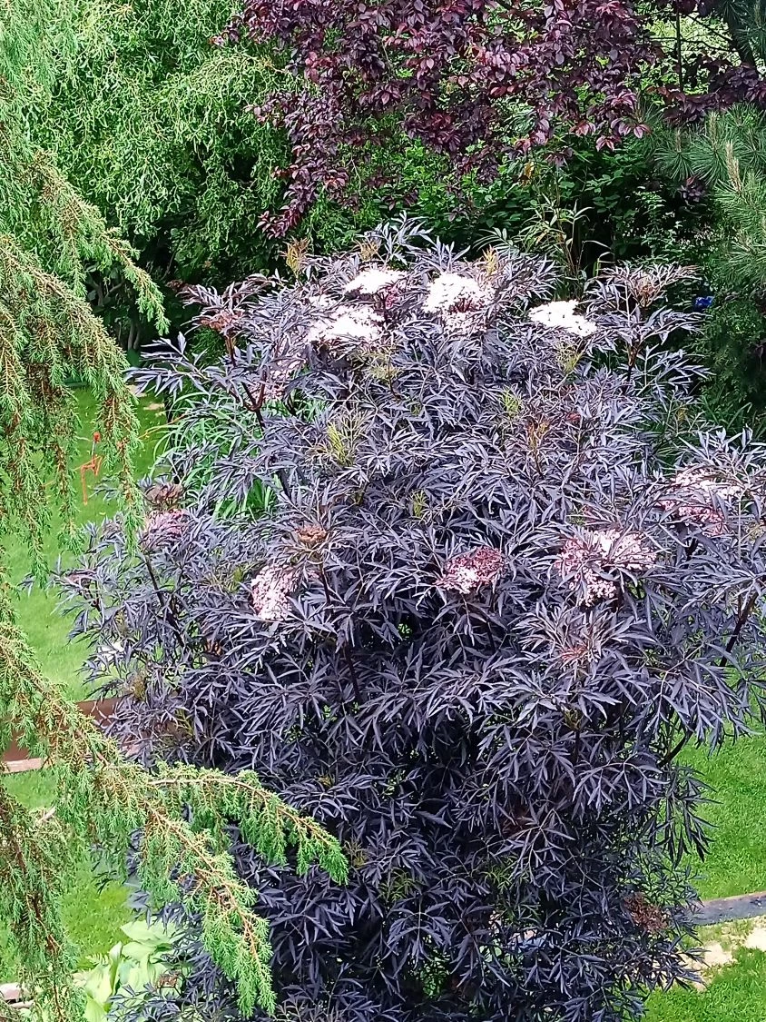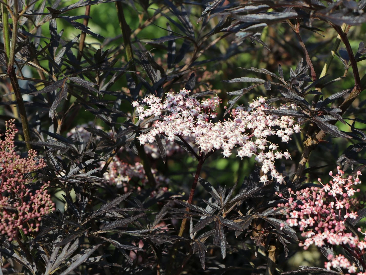 Die kräftig geschlitzten Blätter des Schwarzer Holunder ‚Black Lace‘ ® haben im Austrieb noch eine grünrote Farbe, bekommen später ihre endgültige herrlich tief dunkelrote Tönung mit einer leicht glänzenden Oberfläche. Einen geschmackvollen Kontrast stellen die hübschen Blütendolden dar, die im Mai/Juni in einem adretten weiß erstrahlen und nach Zitronen duften. Die Blütenknospen stellen sich allerdings in rosa dar, was schnell zu einer Farbenvielfalt beim Öffnen der Blüten führt.