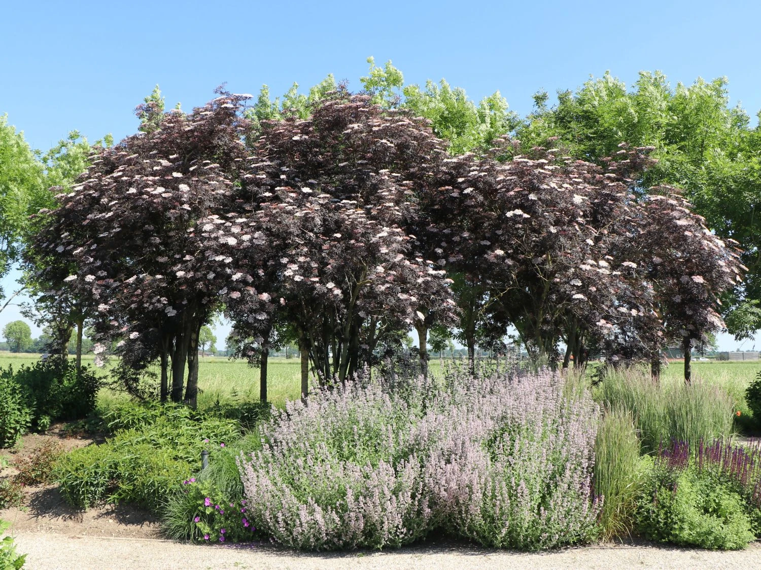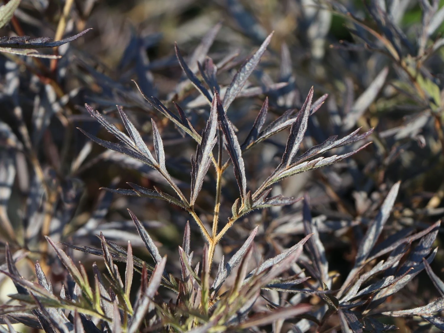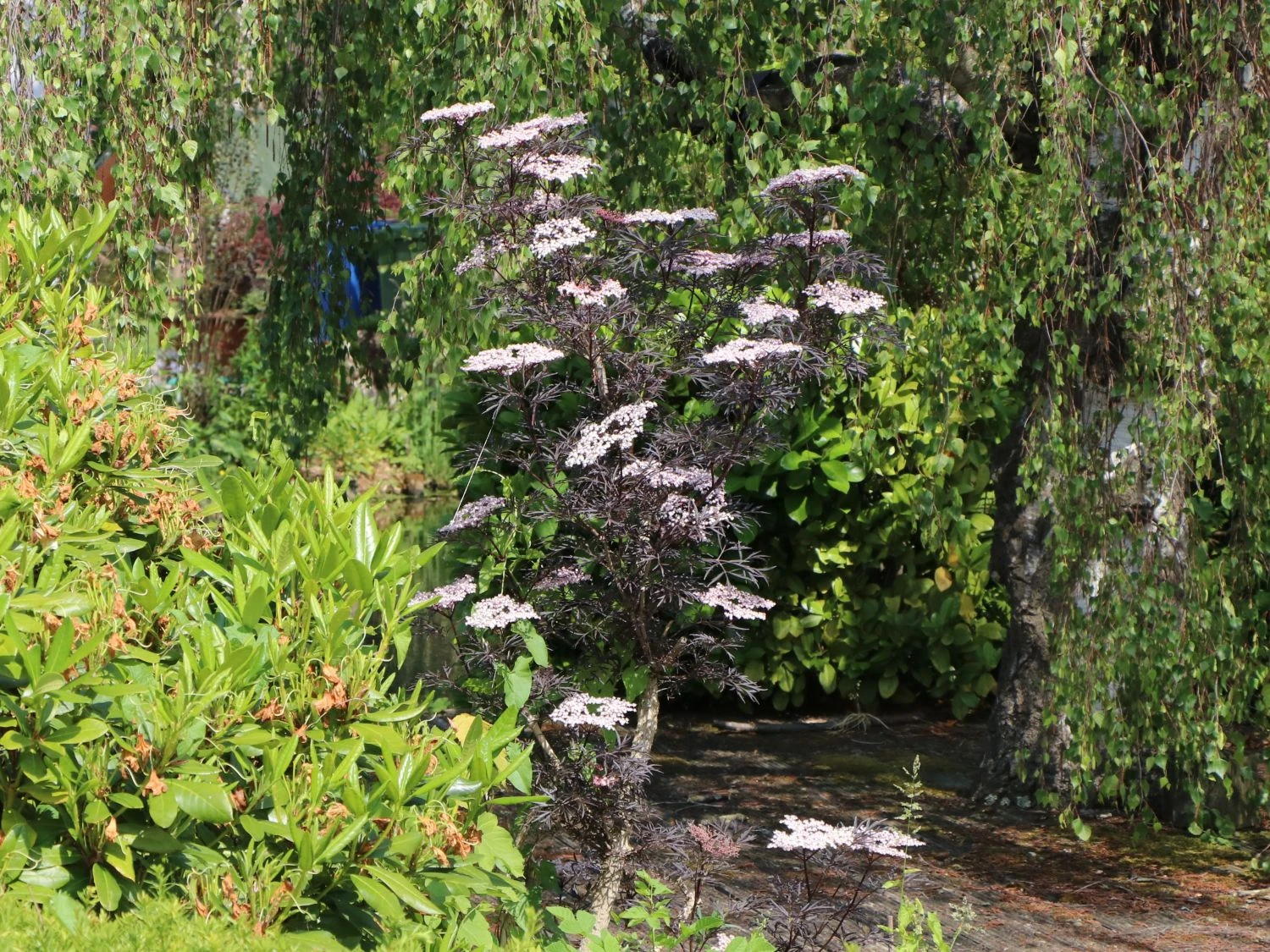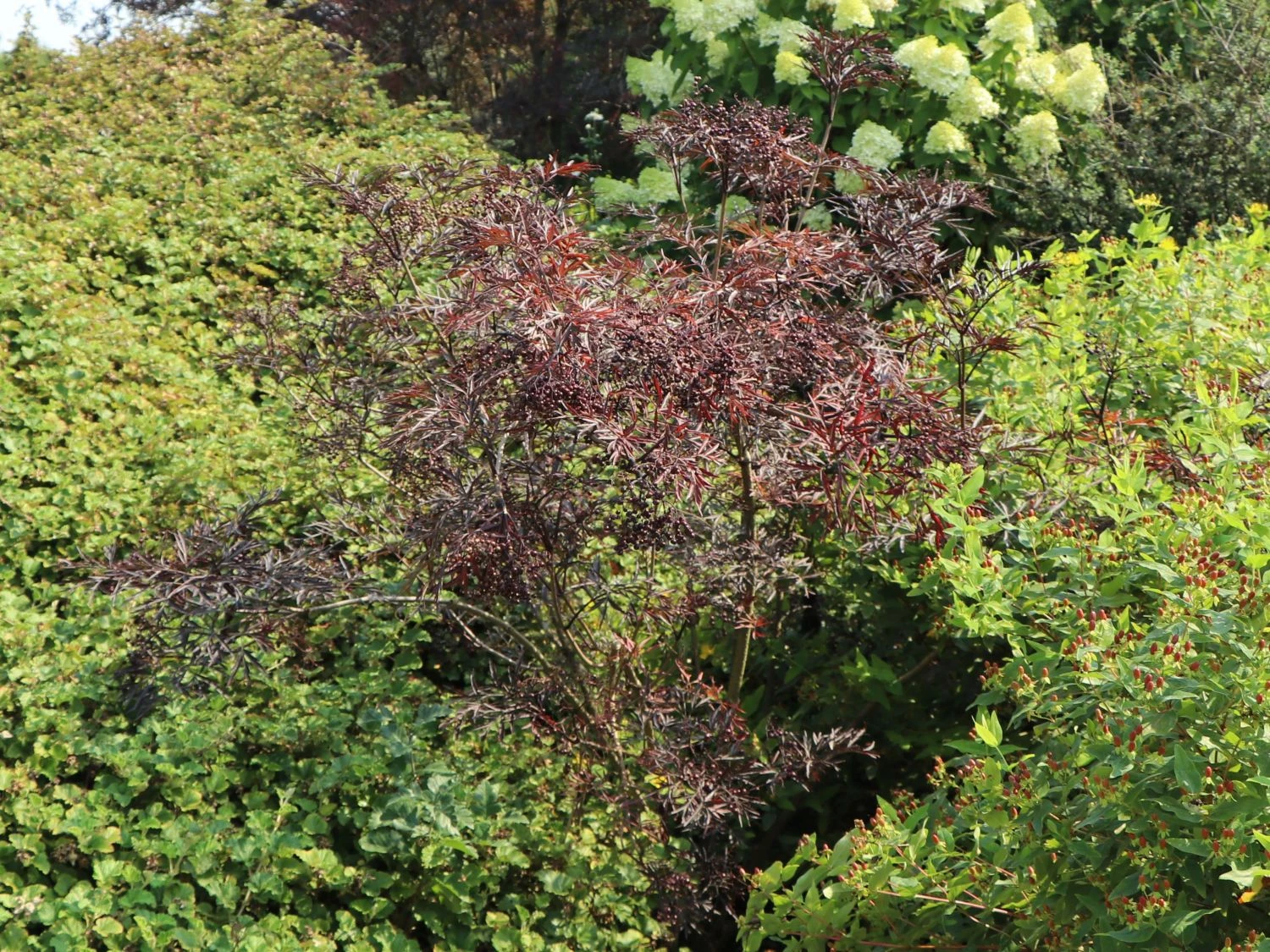 Die kräftig geschlitzten Blätter des Schwarzer Holunder ‚Black Lace‘ ® haben im Austrieb noch eine grünrote Farbe, bekommen später ihre endgültige herrlich tief dunkelrote Tönung mit einer leicht glänzenden Oberfläche. Einen geschmackvollen Kontrast stellen die hübschen Blütendolden dar, die im Mai/Juni in einem adretten weiß erstrahlen und nach Zitronen duften. Die Blütenknospen stellen sich allerdings in rosa dar, was schnell zu einer Farbenvielfalt beim Öffnen der Blüten führt.