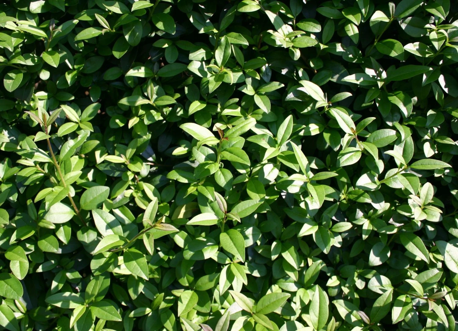 Typisch für den Schwarzgrünen Liguster ‚Atrovirens‘ ist die Fülle an kleinen und dichten Blättern. Sie haben sehr kurze Stiele und eine dunkelgrün glänzende Farbe, die im Herbst ins Violette changiert. Die Form der Blätter ist elliptisch, die Blattoberfläche glatt, leicht ledrig und unbehaart. Je dichter der Strauch, desto kleiner und zierlicher sind die Blätter. Während der Wuchsphase im Frühjahr und Sommer können sie bis zu sechs Zentimeter lang werden. Dieser Liguster ist winterhart und wintergrün, wirft also zum Ende des Winters einmal komplett sein Laub ab und treibt im Frühjahr gleich wieder durch. Wintergrün bedeutet, dass der Schwarzgrüne Liguster ‚Atrovirens‘ kurz vor dem Austrieb einmal für eine kurze Zeit blattlos ist. Kalte Winter übersteht der Liguster dank seiner robusten Eigenschaften problemlos. Sobald es wärmer wird bilden sich nach dem kurzzeitigen Blattverlust wieder frische, grüne Triebe an der robusten Pflanze.
