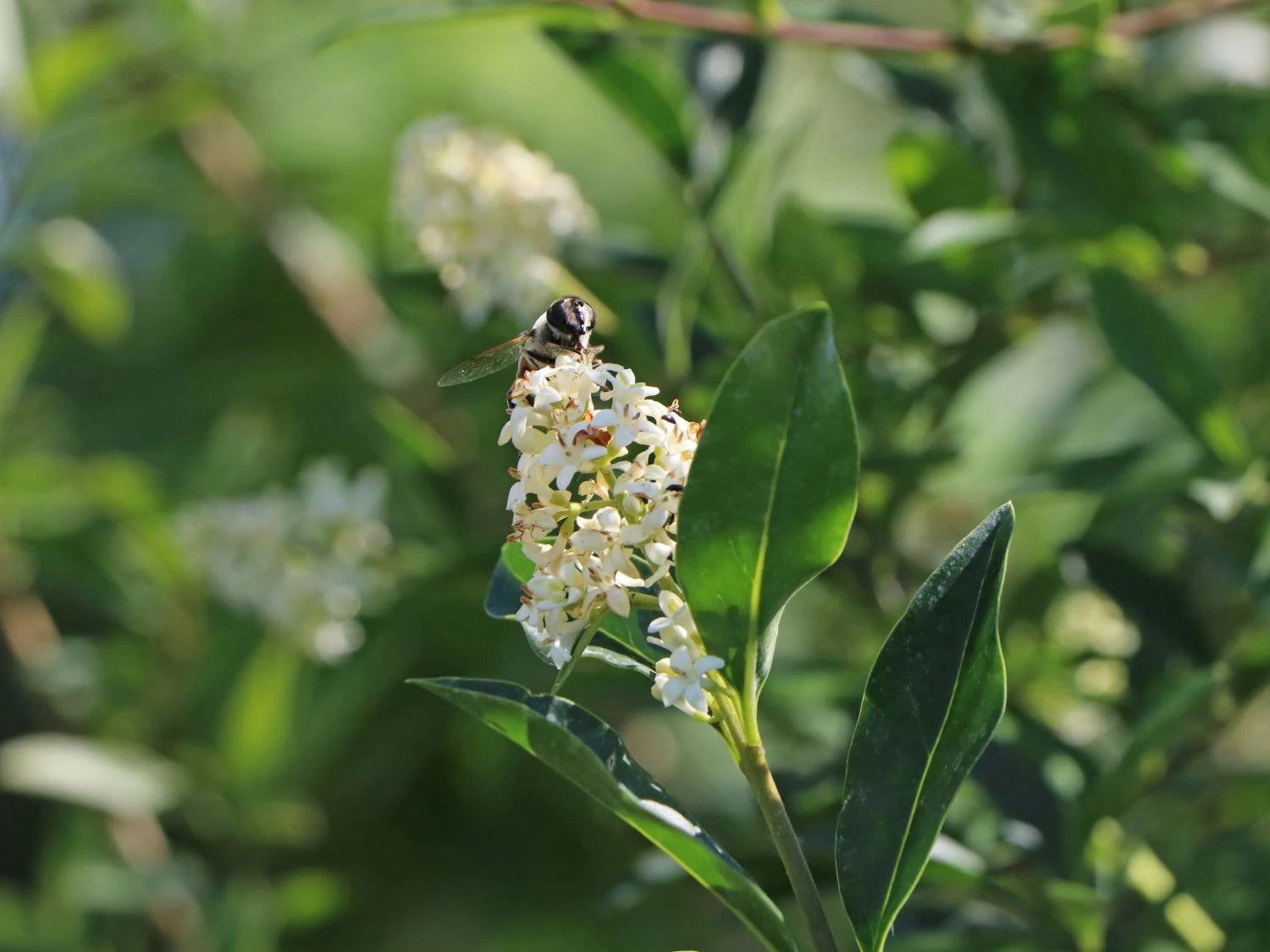 Aufmerksame Beobachter können in Ligustersträuchern und -hecken ein lebhaftes Treiben von Vögeln, Bienen und Insekten beobachten. Die dichte Verästelung bietet Kleintieren Schutz und Nahrung. In einem natürlichen Gartenumfeld bildet der Liguster sein eigenes, kleines Biotop. Die Blüten des Schwarzgrünen Ligusters ‚Atrovirens‘ sondern ihren Nektar, der von Wild- und Honigbienen geschätzt wird, am Boden des Blütenkelchs ab. Während der Blütezeit lässt sich ein reges Bienentreiben verfolgen. Auch Schmetterlinge lieben und umschwirren Ligusterblüten. Sogar seltene Falterarten wie Ochsenaugen oder Perlgrasfalter können, je nach sonstigem Gartenumfeld, beobachtet werden. Einige Falterarten legen ihre Raupen im Liguster ab. In sehr dichten Hecken kann eine große Artenvielfalt entstehen.