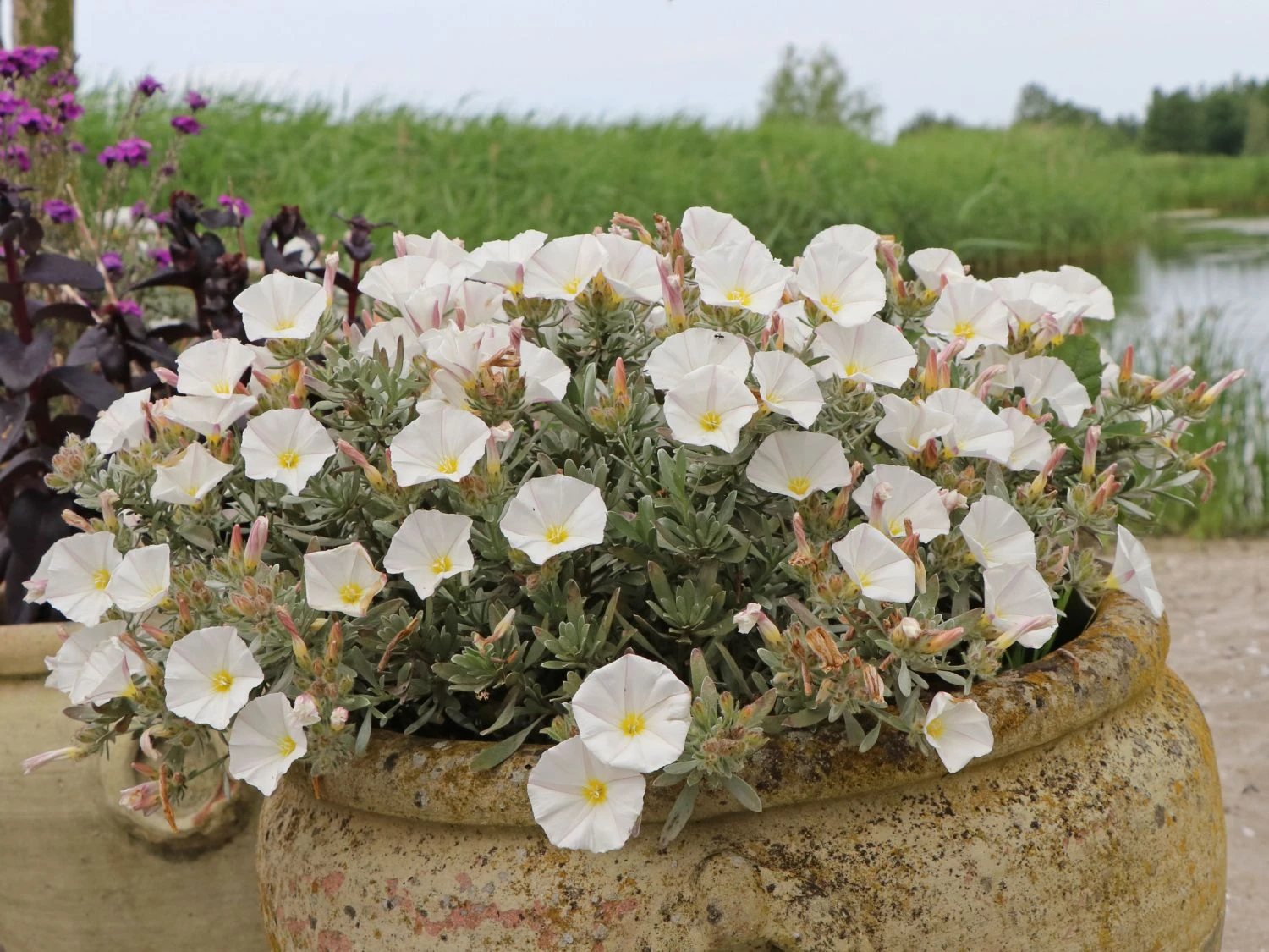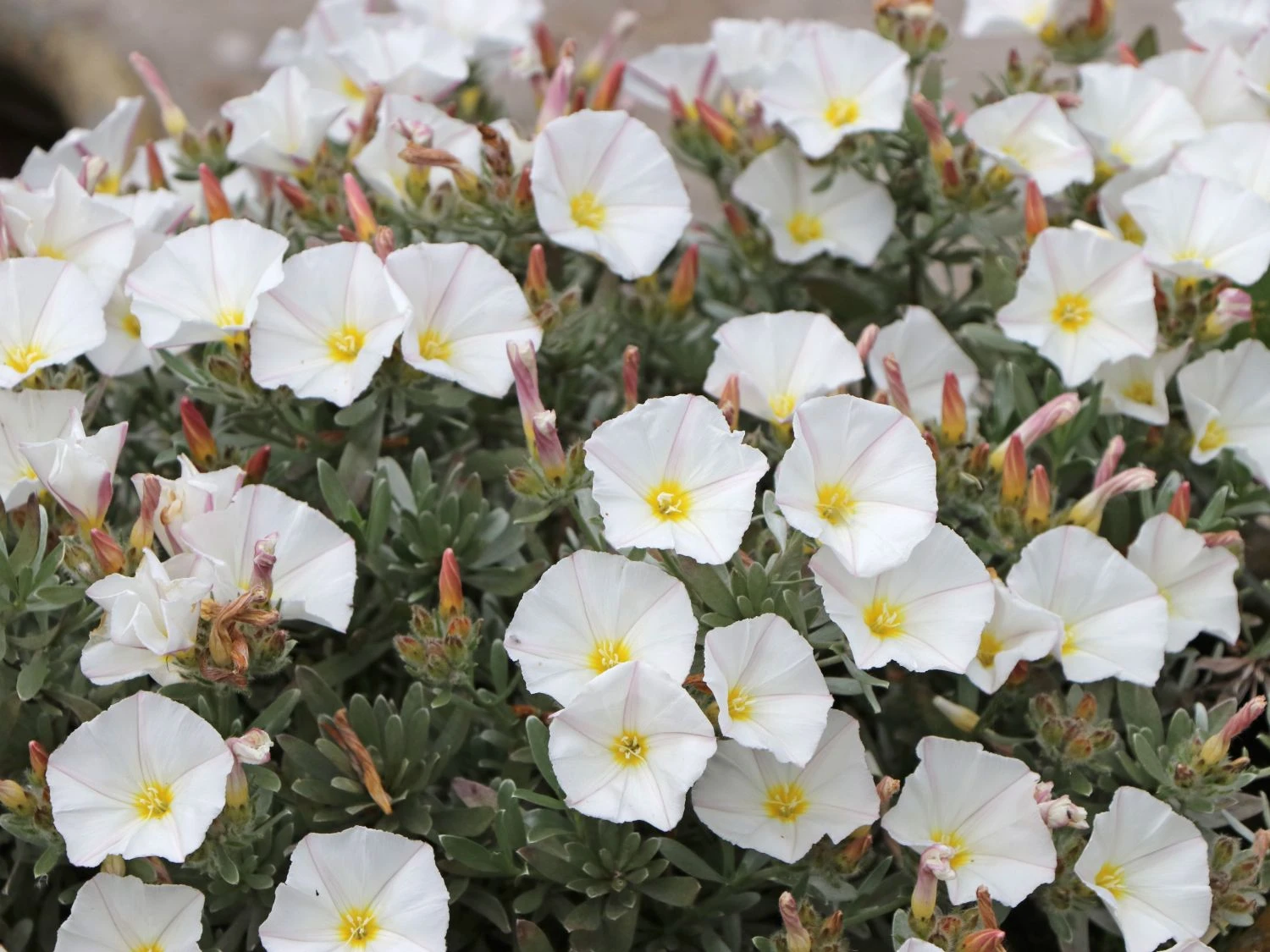 Nicht selten wächst die Silberwinde an einem idealen Standort sehr dicht und kompakt, so dass die reinweiße Blütenpracht ebenso dicht zusammen sitzt und eine eindrucksvolle Fülle präsentiert. Als Einzelpflanze ist dieses Exemplar ausgezeichnet einsetzbar. Sie füllt kleinere Lücken in den Beeten oder kann gut überlegt eingesetzt ein besonderer Blickfang für jeden Gartenbesucher sein. Am Rande von Gehölzen kann sie wunderbar füllen wirken und auf Freiflächen ist sie ein wahrer Eyecatcher. Die Convolvulus cneorum lässt sich auch mit anderen Gartenpflanzen optimal kombinieren. So können effektvolle Akzente im Garten geschaffen werden. Besonders schön wirken Arrangements mit knallroten oder -blauen Gartenpflanzen, die zusammen mit der Convolvulus cneorum für eine schöne Farbexplosion sorgen.