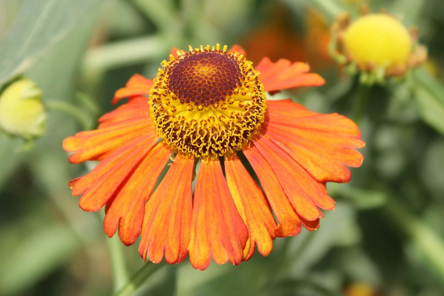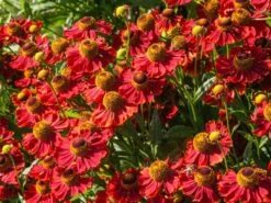 Von Anfang Juli bis Ende August blüht Helenium x cultorum ‚Baudirektor Linne‘ in wunderschönem kräftigen rot bis rotbaun. Die körbchenförmigen Blüten wirken samtig und sind von mittlerer Größe. Doch auch nach dem Abblühen verfügt die Sonnenbraut ‚Baudirektor Linne‘ immer noch über große Attraktivität und präsentiert die wundervollen Blütenstände, an denen sich späte Samenkapseln gebildet haben, bis in den September hinein. An einem sonnigen Standort kann Sonnenbraut bis zu 120 Zentimeter hoch und auch sehr bereit werden.