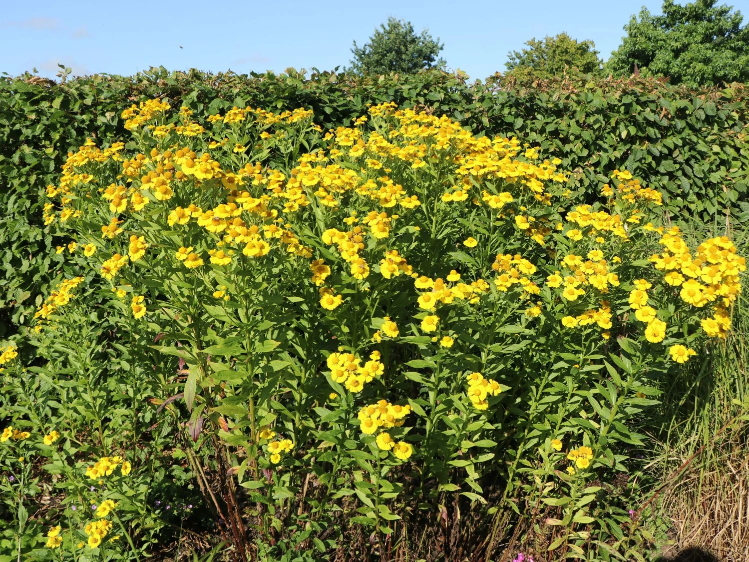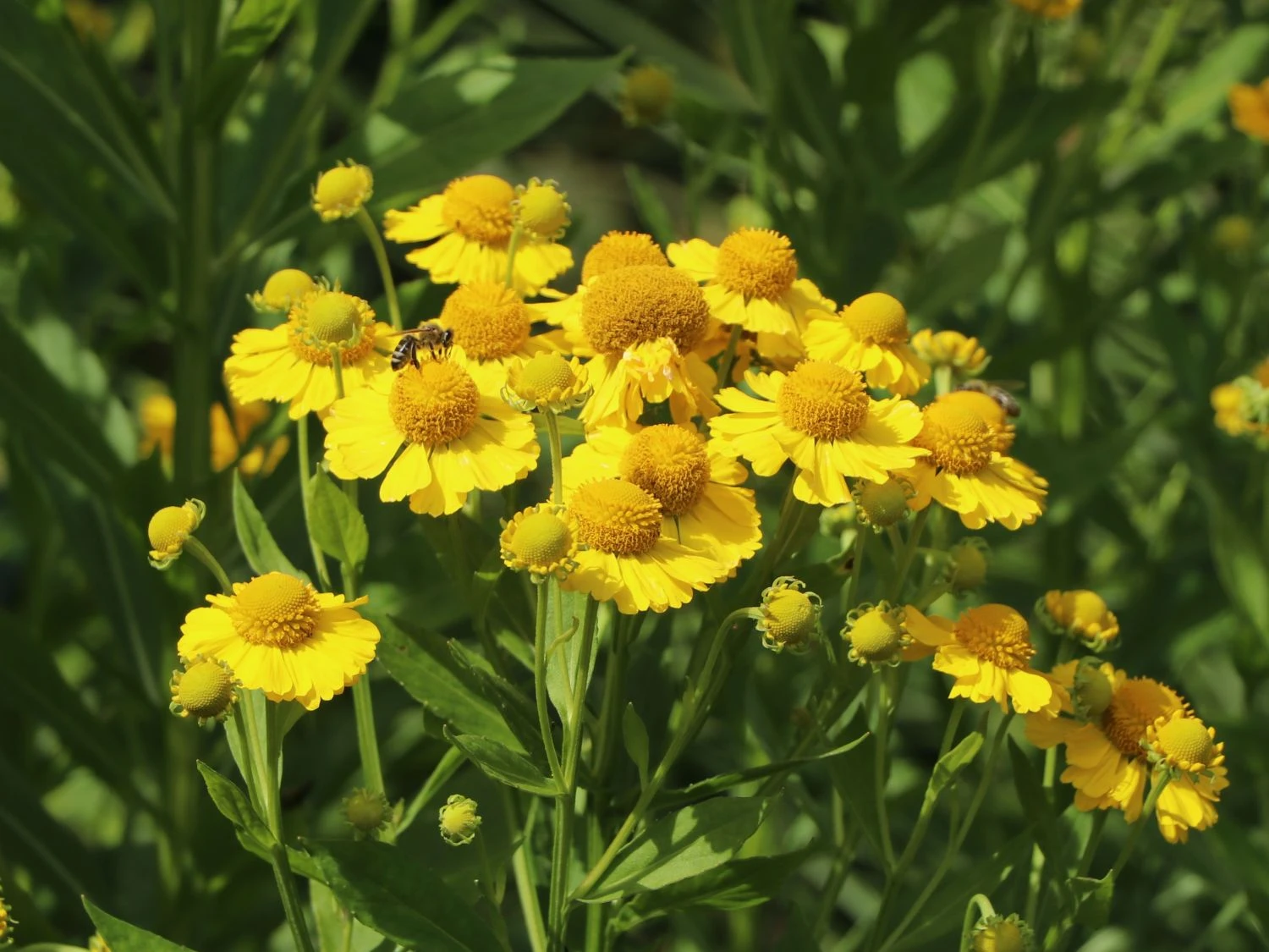 Die Sonnenbraut ‚Kugelsonne‘ mit dem botanischen Namen Helenium erinnert durch ihr Aussehen der Blüten an die Sonne. Deswegen gab der Botaniker Carl von Linné ihr wegen den prachtvollen Blüten, welche an fröhliche Sonnengesichter erinnern den Namen Helenium, in Anlehnung an Helios dem griechischen Sonnengott. Sie blüht ab Anfang Juni sehr reichblütig und überzeugt durch ihre imposante Wuchshöhe in Hochsommermonaten von bis zu 160 Zentimetern. Genau ausgesprochen wird die botanische Bezeichnung insgesamt als Helenium x cult. ‚Kugelsonne‘.
