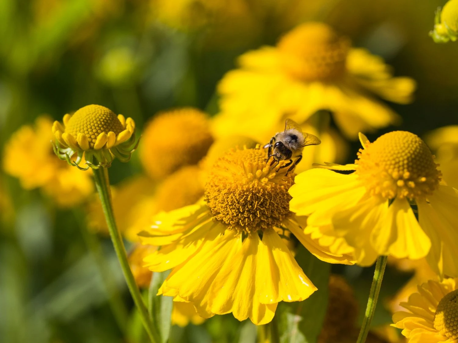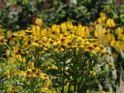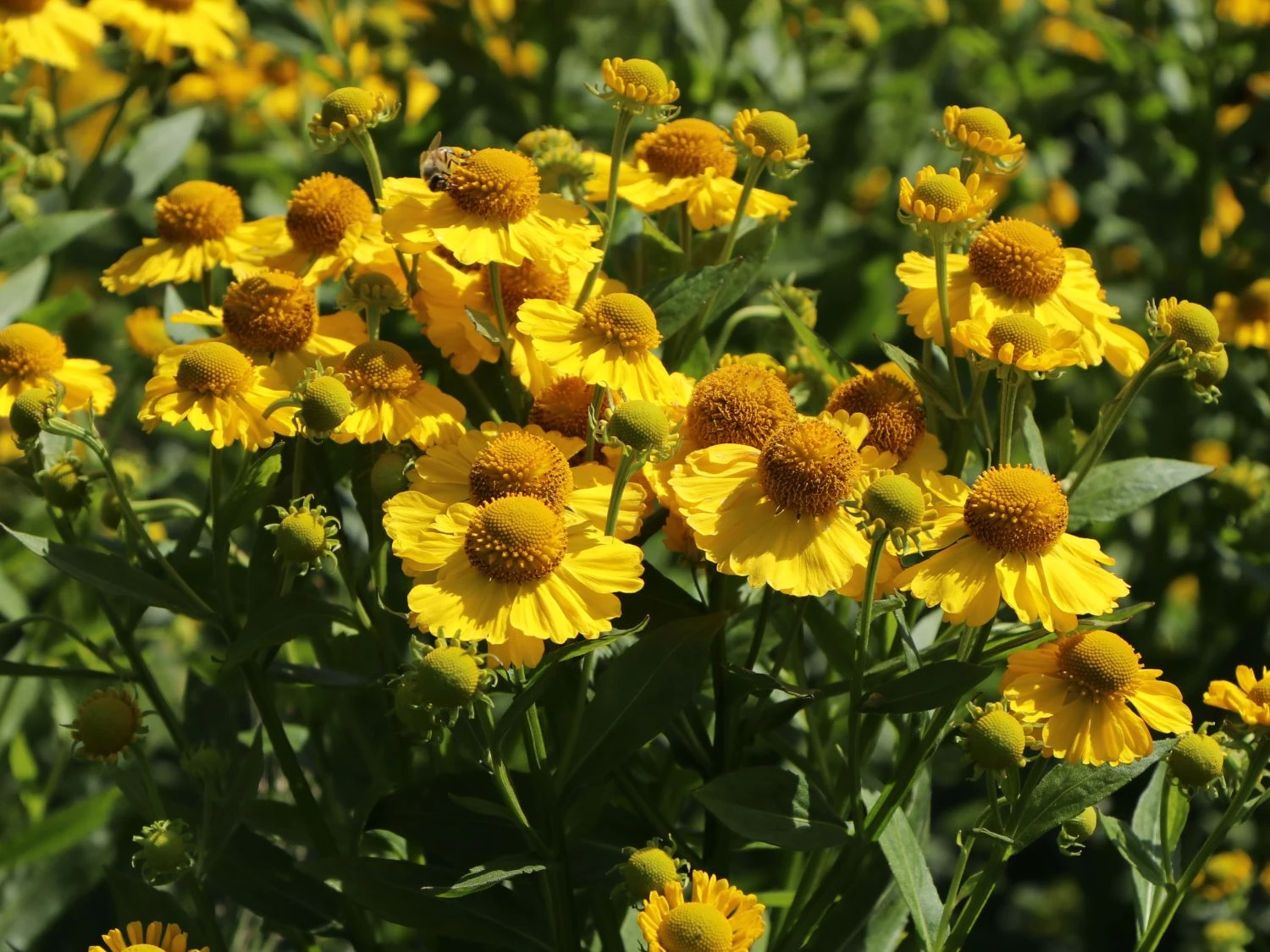 Diese anspruchslose Gartenstaude lässt sich ganz problemlos auch in vorhandene Staudenbeete integrieren. Pro Quadratmeter benötigt der Gärtner ungefähr 4 Pflanzen, die dann zu einem großen, tiefgoldgelben Staudentuff zusammenwachsen und sich eindrucksvoll mit ihren Blüten der Sonne entgegenstrecken. Die Sonnenbraut ‚Sonnenwunder‘ ist zwar durch ihren aufrechten, horstigen Wuchs recht standfest, doch ein wenig Unterstützung ist aufgrund ihrer Größe von 120 cm nicht verkehrt. So bleibt sie in Form und die langen Stängel fallen nicht seitlich zu Boden. Regelmäßige Wassergaben und das entfernen der verwelkten Blüten ist selbstverständlich für jeden Gärtner und lässt die Helenium x cult. ‚Sonnenwunder‘ über einen langen Zeitraum wunderbar blühen.