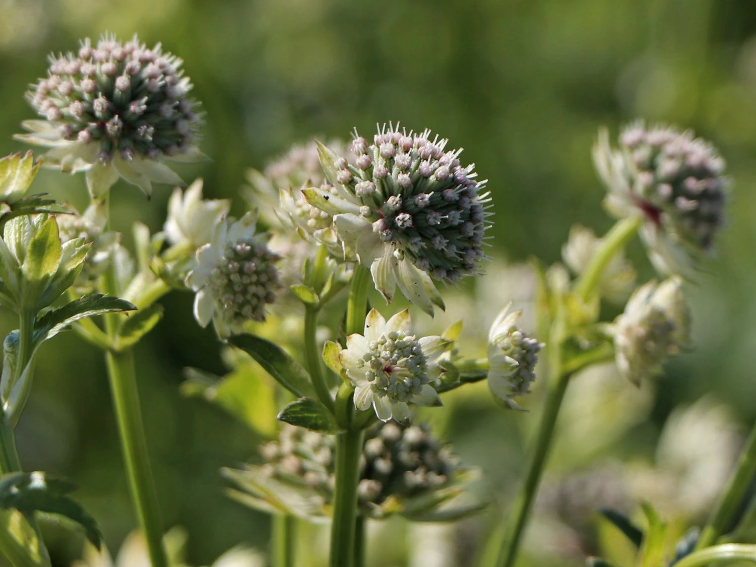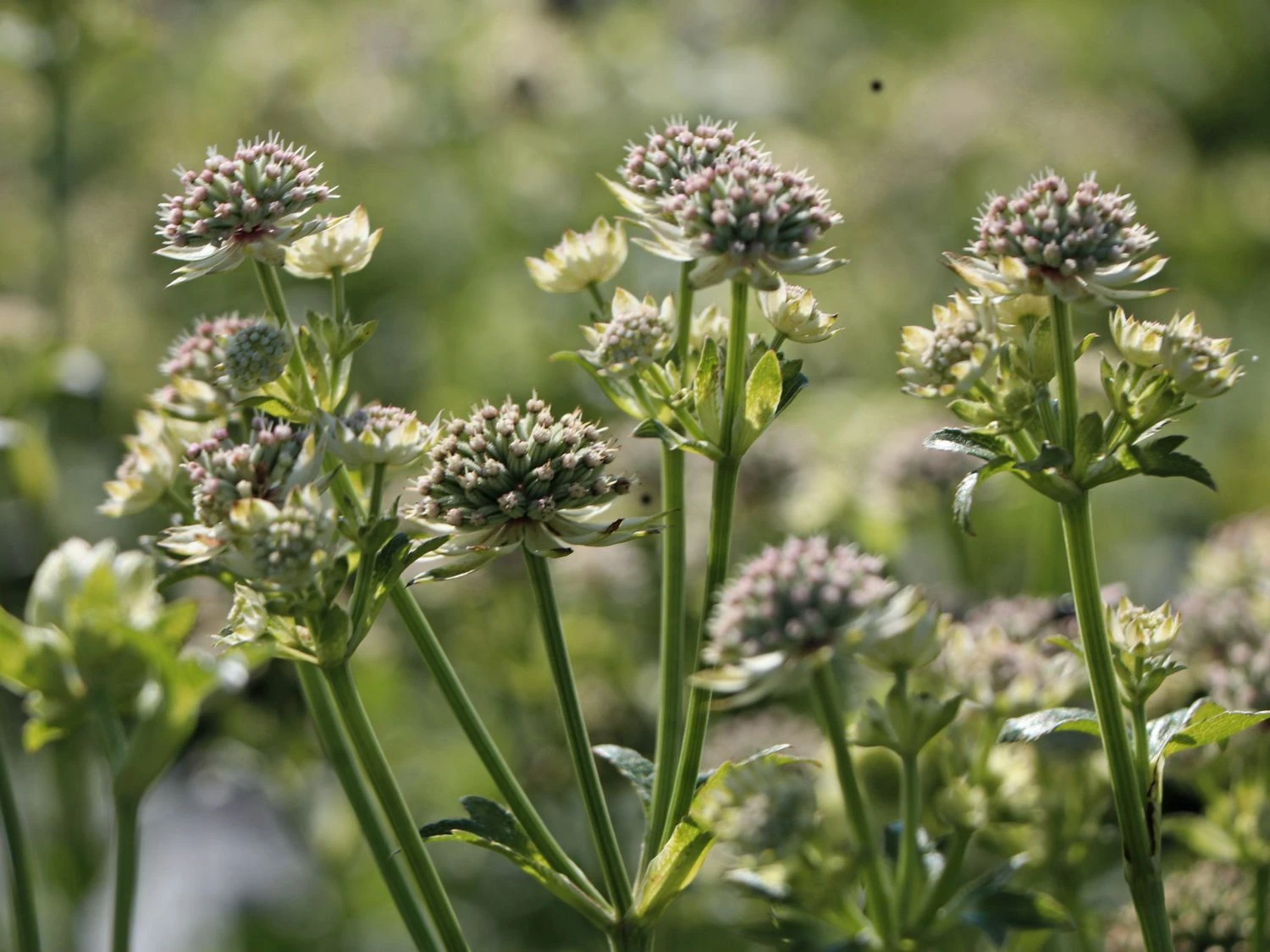 Die Sterndolde namens ‚Star of Billion‘, die zur lateinischen Familie der Astrantia major gehört, ist eine besondere Staude. In der Familie der Astrantia hat sie die hellste Farbe in beeindruckenden Schleierblüten und ist eine beliebte Schnittpflanze. Die Blüten haben Farben von weiß und silber bis zu rosa und grünlich. Die Blattmitte ist grün-weiß und versammelt um sich Hochblätter in Tönen von weiß bis rosa. Jedes Blütenblatt besitzt eine grüne Spitze und die Laubblätter sind auffällig tief gelappt.
