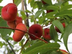 Der Tellerpfirsich ‚Saturne‘ bringt süße, extrem aromatische Früchte hervor. Das saftige Fruchtfleisch löst sich mühelos vom Kern und die flache Form der Früchte macht den Genuss kinderleicht. Diese neue Sorte benötigt keine Befruchtersorte in der Nähe und ermöglicht eine Kultur auf kleinstem Raum. Ab August lässt sich das köstliche, säurearme Sommerobst von (bot.) Prunus persica ‚Saturne‘ ernten. Grundlage für eine reiche Ernte sind ausreichend Bodennährstoffe und ein sonniger Standort. Der Tellerpfirsich ‚Saturne‘ wächst mit der Zeit zu einem mittelhohen, breitkronigen Obstgehölz heran. Seine Äste sind kräftig und verzweigen sich mehrfach. Der jährliche Zuwachs der Zweige liegt zwischen 30 und 50 cm. Mit geeigneten Schnittmaßnahmen lässt sich das Obstgehölz auf einer guten Erntehöhe halten. Im Frühjahr wird der Tellerpfirsich ‚Saturne‘ mit seinen rosa Blütenwolken zum absoluten Hingucker im Garten. Nektar und Pollen der Obstbaumblüte ziehen viele Insekten magnetisch an. Eine reife Frucht hat ein cremefarbenes, leicht rötliches Fruchtfleisch. Das Aroma der flachen, kleinen Plattpfirsiche ist unvergleichlich. Jeder Biss von seinem weichen, saftigen Fruchtfleisch mit dem süßen, von wenig Säure bestimmtem Geschmack ist ein paradiesisches Vergnügen.