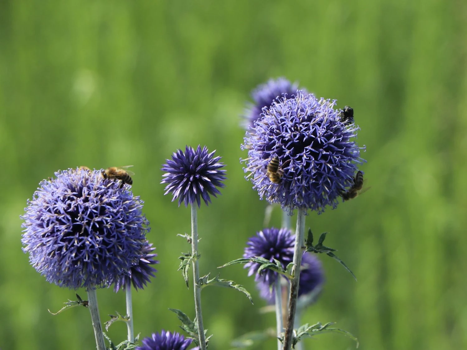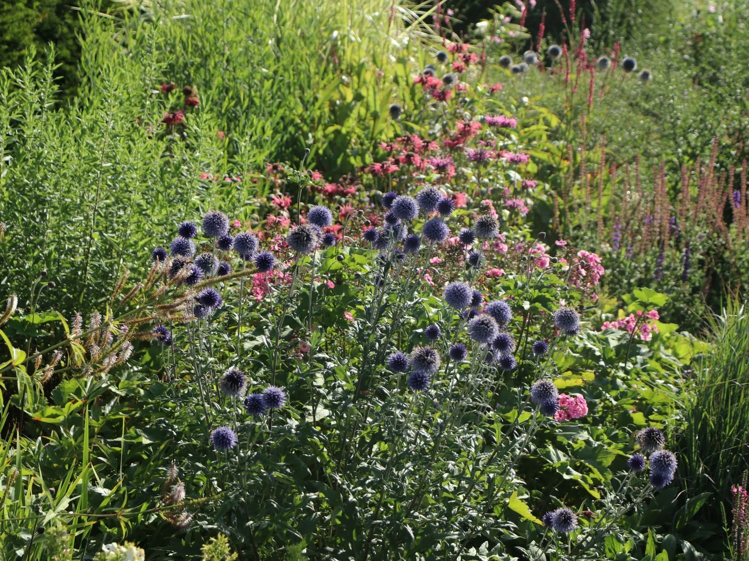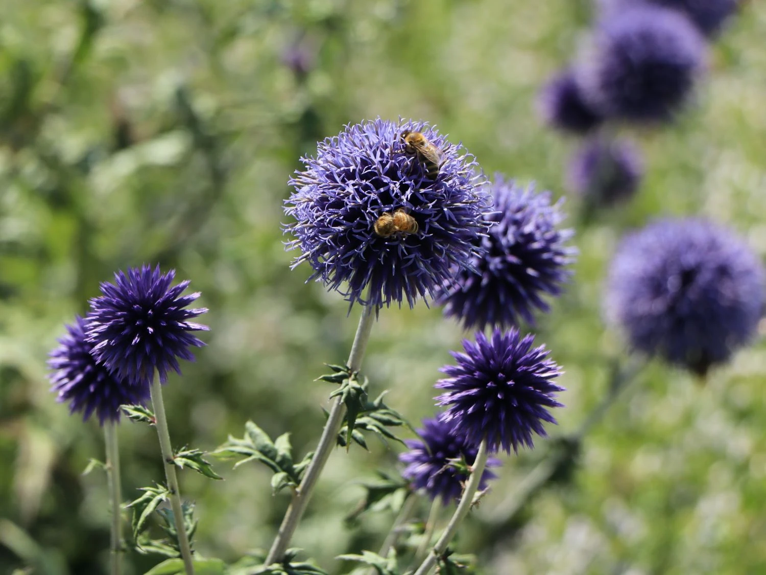 Die Veitchs-Kugeldistel ‚Veitchs Blue‘ ist mit ihren blauen Blütenkugeln ein ungewöhnlicher Blickfang im Garten. Die kugeligen Blüten leuchten in Stahlblau und wirken anziehend auch auf Bienen und Hummeln. Daher ist die insektenfreundliche (bot.) Echinops ritro ‚Veitchs Blue‘ auch bei Imkern beliebt. Die stahlblauen Blüten harmonieren perfekt mit den graugrünen Blättern der Staude, die nur wenige Stacheln besitzt. Die Veitchs-Kugeldistel ‚Veitchs Blue‘ wächst aufrecht und horstig. Schon als Einzelpflanze ist diese Kugeldistel im Beet attraktiv. In einer kleinen Gruppe kommen ihre Blütenköpfe besser zur Geltung. In Rabatten und gemischten Beeten hat sie einen schönen Auftritt und dient häufiger auch als ausgezeichneten Begleiter für Rosen. Auch als Schnittblume nutzt der Pflanzenfreund diese auch als Ruthenische Kugeldistel bekannte Staude gerne.
