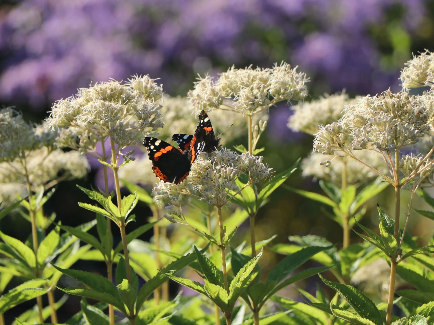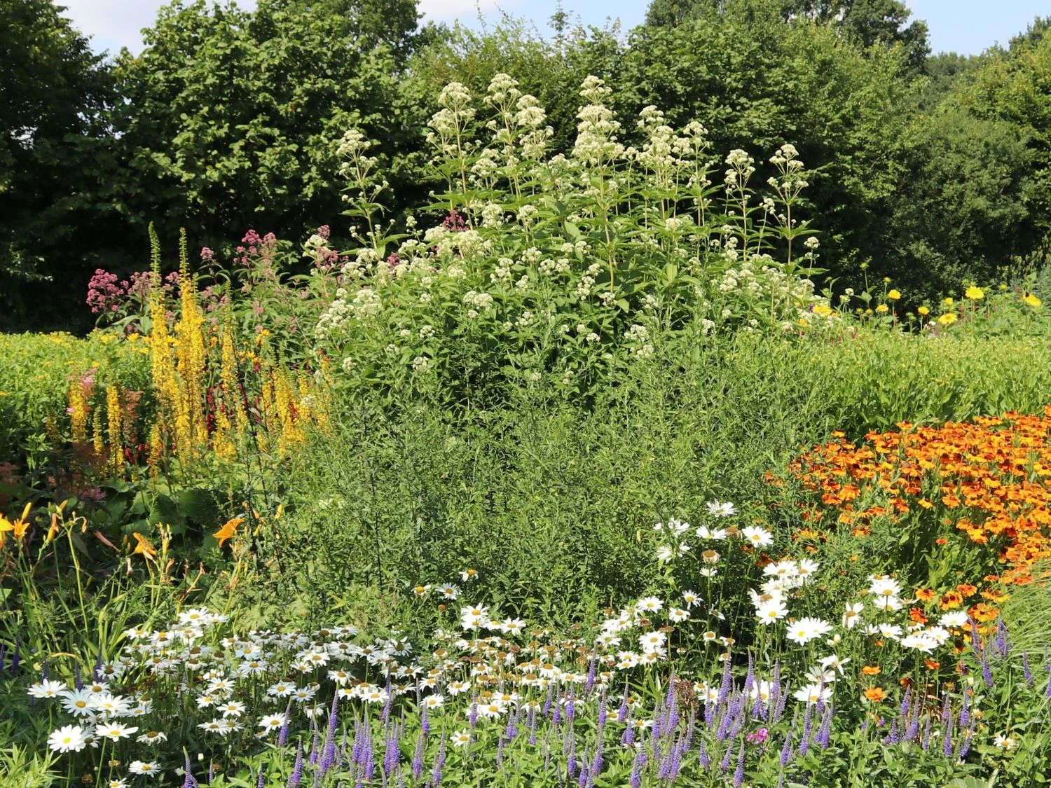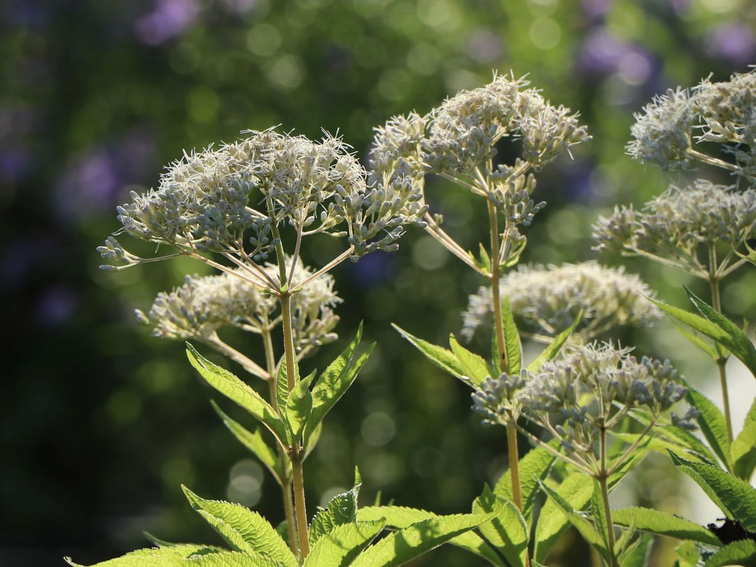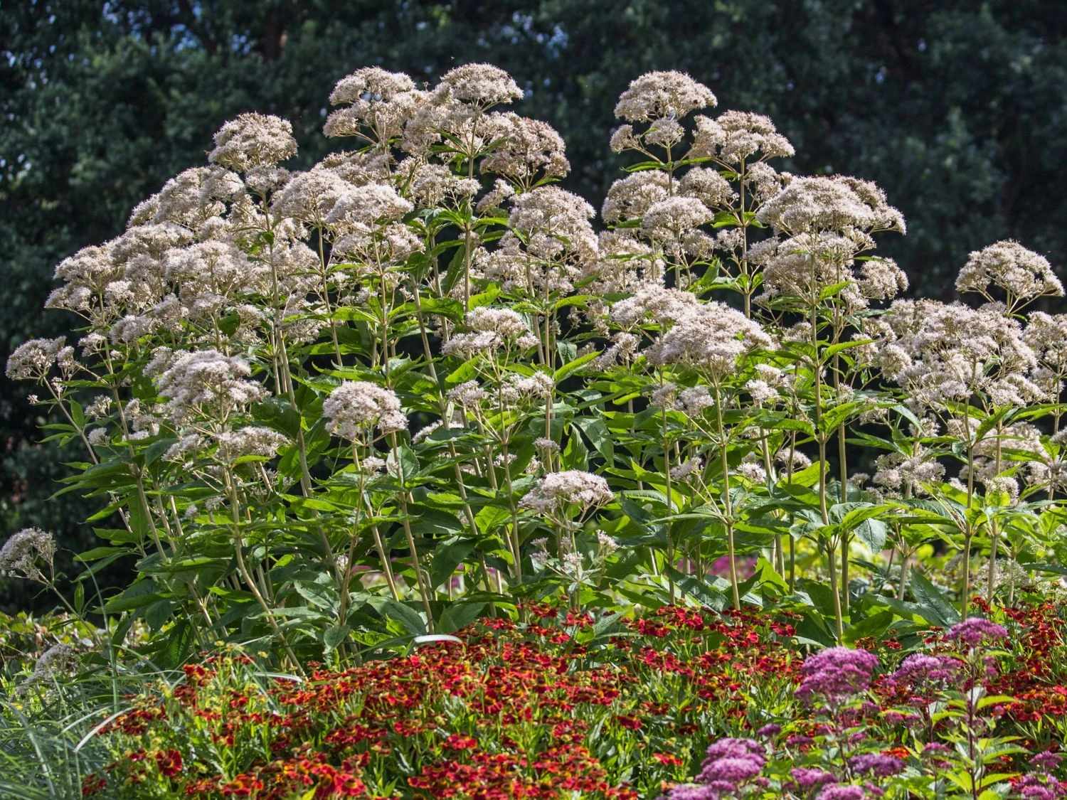 Die Pflanze trägt wegen ihrer Blätterform in einigen Gegenden ebenfalls den Namen Wasserhanf. Ursprünglich in Nordamerika beheimatet, gibt es den Wasserdost seit dem Mittelalter in unseren Breitengraden. Früher als Medizin für Galle und Leberleiden verwendet. Eupatorium fistulosum ‚Bartered Bride‘ ist in der Familie der Asterngewächse beheimatet. Die sommergrüne Pflanze hat gesägte, lanzettliche Blätter. Die schönen reinweißen Blütenstände erfreuen den Betrachter mit doldenförmigen Blütenstände, die von Juli bis September blühen und das Beet wird zur Bienenweide. Schmetterlinge und andere Insekten freuen sich über diesen Gartenbewohner. Gerne steht der Weiße Wasserdost ‚Bartered Bride‘ einzeln oder in der Gruppe (maximal drei Stück), wobei zwei Stück pro Quadratmeter ausreichen. Bei dem kräftigem, buschigen und horstartigen Wuchs genügt dies. Mit einer Höhe von 150 bis 170 Zentimetern bereichert die Staude das Blumenbeet. Bei Sonne bis Halbschatten gedeiht sie am Besten. Der Boden sollte frisch bis feucht und durchlässig sein.