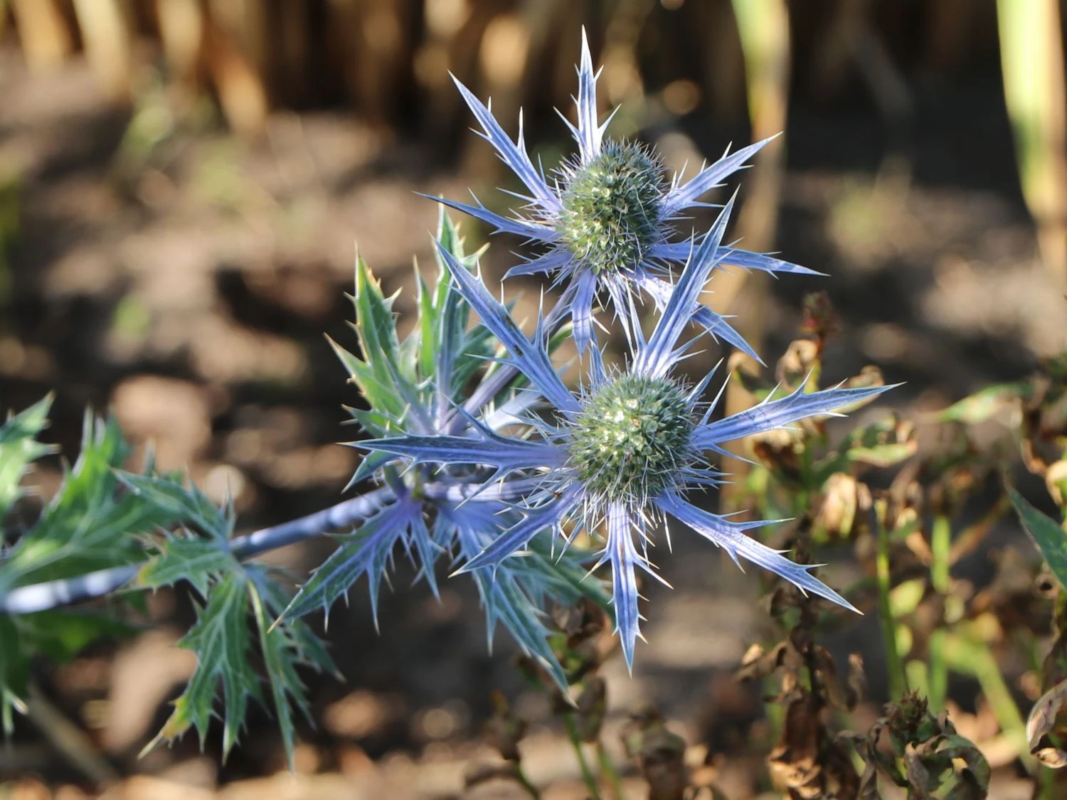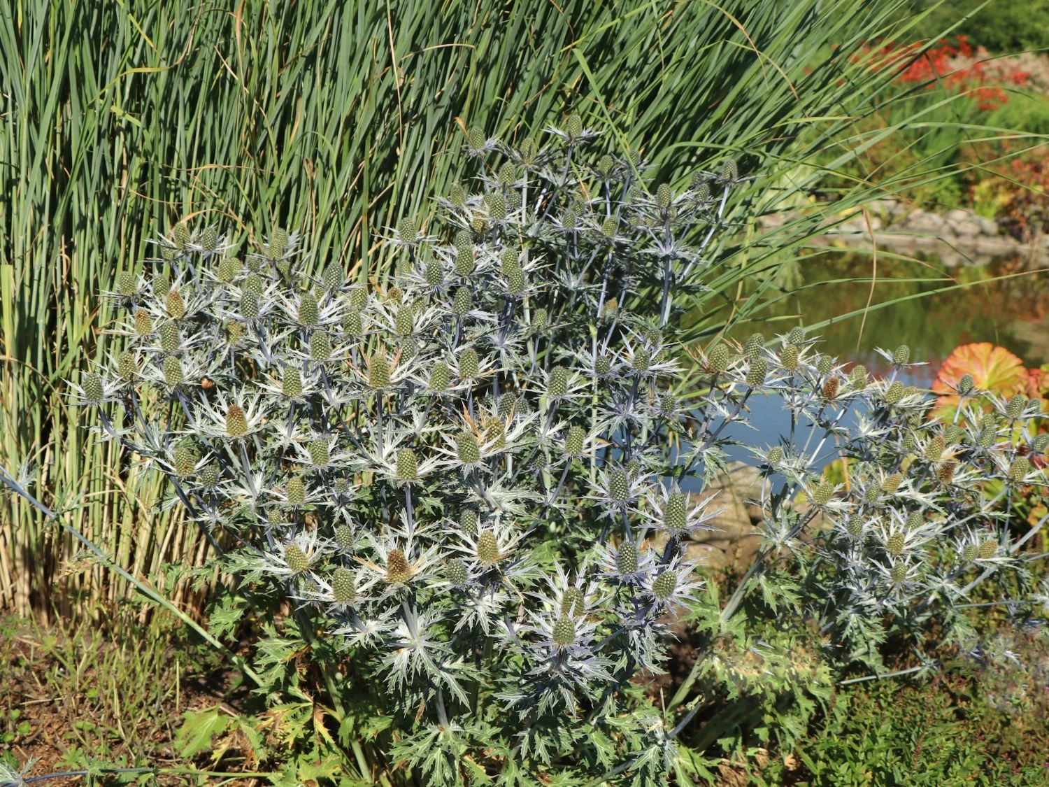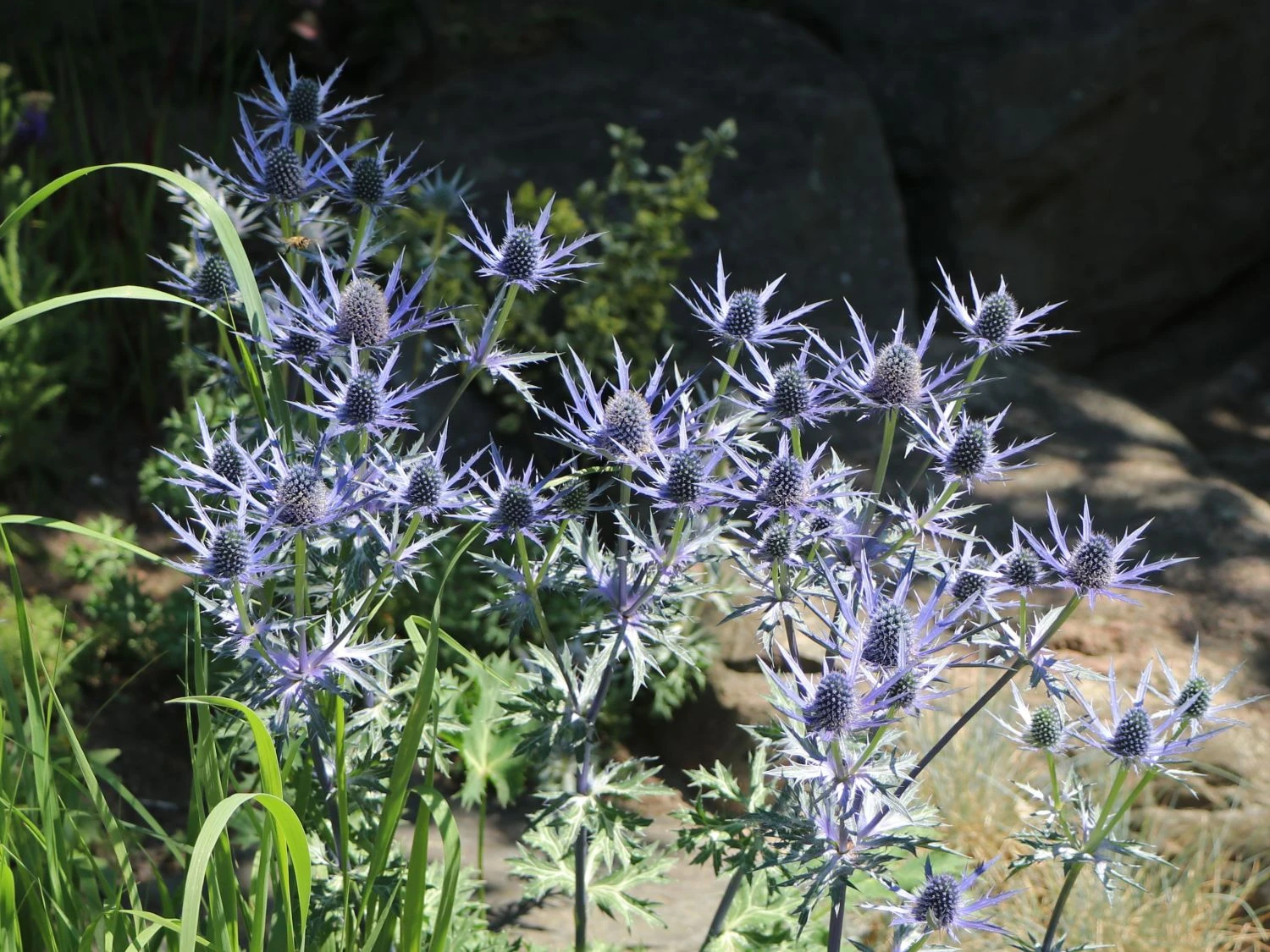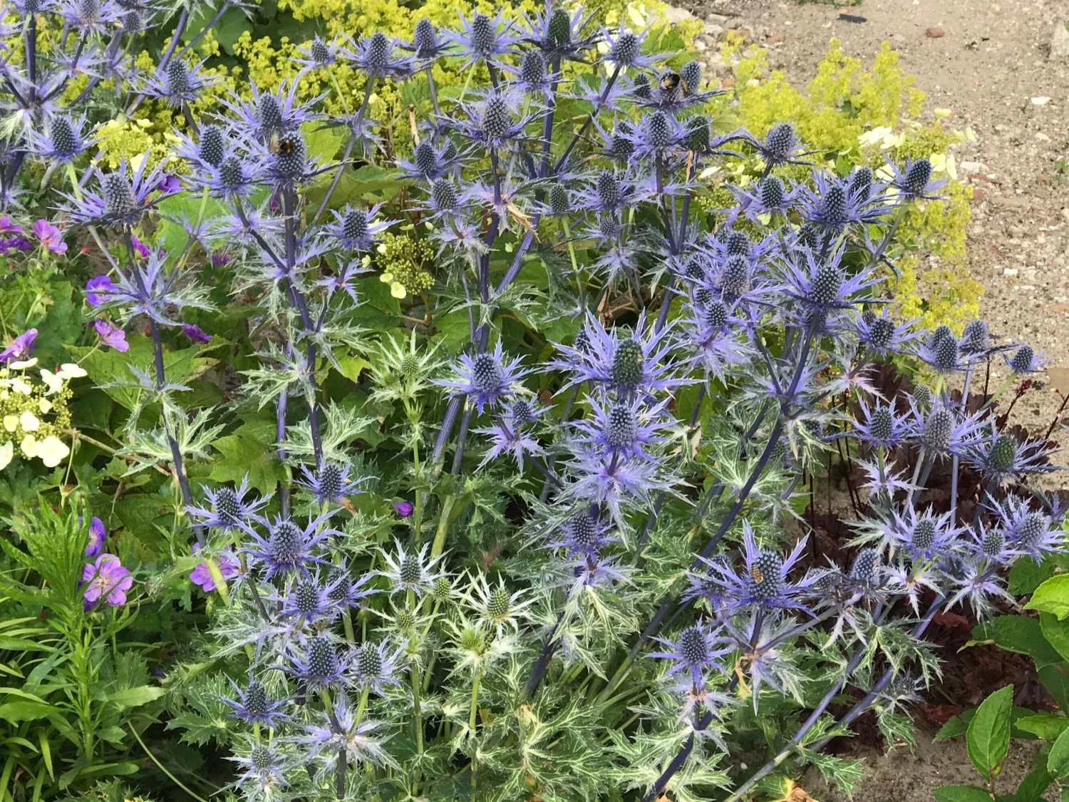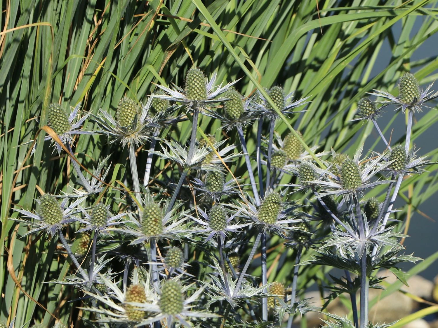 Die haltbaren Blüten auf drahtigen Stängeln eignen sich bestens für den Schnitt. Eryngium x zabelii ‚Big Blue‘ passt sowohl in naturnahe Pflanzungen als auch ins sonnige Staudenbeet. Eine pflegeleichte, unkomplizierte Staude, die über Wochen Farbe und Struktur gibt. Am besten eignet sich für Eryngium x zabelii ‚Big Blue‘ ein normaler, eher trockener Gartenboden. In der Zeit von Juni bis August lassen sich die stahlblauen Blüten bewundern. In der Höhe erreicht die schöne Zierstaude bis zu 70 Zentimeter und breitet sich auf einen Durchmesser von bis zu 50 Zentimeter aus. Beim Bepflanzen einer größeren Fläche ist auf einen Pflanzabstand von rund 50 Zentimeter zwischen den einzelnen Exemplaren zu achten. Der Wuchs von Zabels Mannstreu ‚Big Blue‘ ist lockerhorstig. Die aufrecht wachsende Staude ist trockenheitsverträglich, schmückt sich neben den Blüten mit zierenden Blättern, dient als Schnittblume und ist eine ausgezeichnete Nährpflanze vieler Insekten.