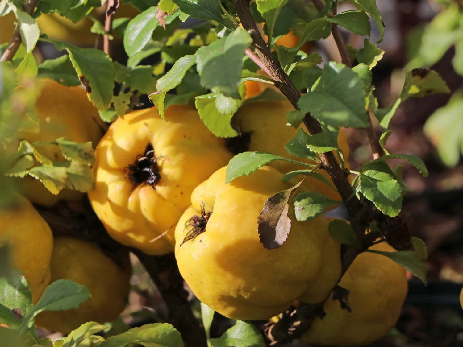 Die Zierquitte ‚Cido‘, essbar, auch als Nordische Zitrone bekannt, ist eine attraktive Zierpflanze. Sie bietet tolles Wildobst, das Seltenheitswert hat. Schön bei dieser Sorte der Zierquitten ist, dass sie kaum Dornen besitzt. So lassen sich die Früchte gefahrlos ernten. Ein weiteres großes Highlight von (bot.) Chaenomeles ‚Cido‘ ist, dass ihre Quitten einen ausgesprochen hohen Vitamin-C-Gehalt aufweisen. Zwar ist der Geschmack als säuerlich zu beschreiben, doch die Früchte sind essbar und lassen sich ausgesprochen gut weiterverarbeiten. Beispielsweise zu Marmelade oder Gelee. Gelb leuchten die großen Früchte der Zierquitte ‚Cido‘, essbar auf. Nicht umsonst trägt das Gehölz den Beinamen Nordische Zitrone! Die Früchte sind optisch ein großer Reiz im Garten. Ab September und dann bis November erlangen die Früchte ihre Genussreife und sind lagerbar.