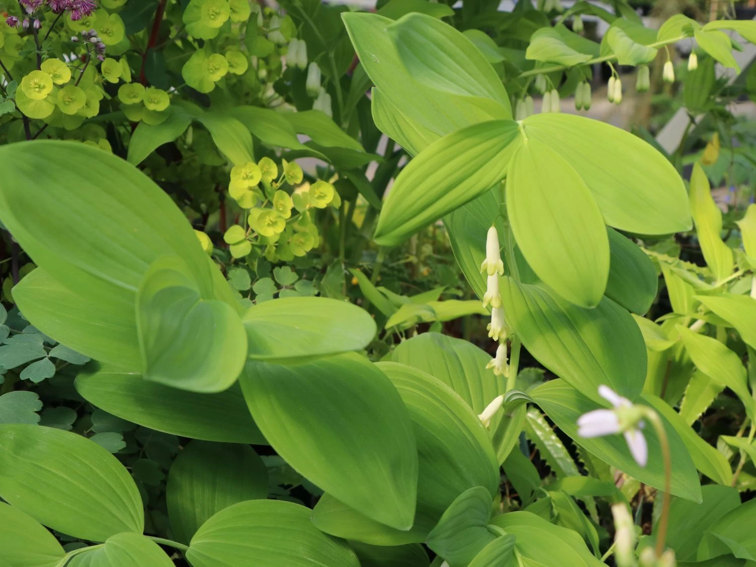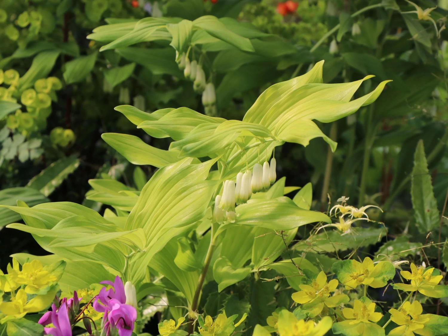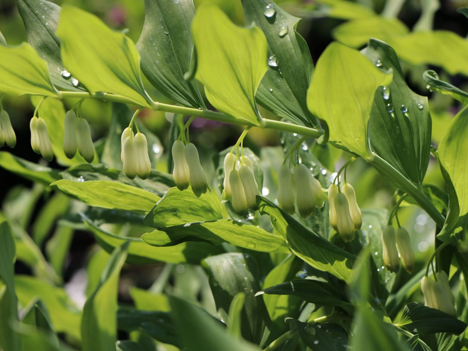 Als einzelne Pflanze wirkt das Zweiblütige Salomonssiegel filigran. In einer Gruppe gepflanzt, verstärkt sich seine Präsenz und verträumte Szenerien entstehen. Wild-romantischer Charme mit elfengleichen Blüten! Diese Reize spielt die Staude als adrette Bewohnerin eines Kübels in besonderem Maße aus. Platziert sie der Pflanzenfreund an seinem liebsten Sitzplatz, selbstverständlich im Halbschatten, lässt sich die zarte Blüte gut betrachten. Polygonatum biflorum bringt jeden Gärtner während der Blütezeit von Mai bis Juni zum Träumen. Aus den kleinen weißen Blüten entwickeln sich nach der Blütezeit kleine schwarzblaue Beeren, die giftig sind. Das grüne Blatt wirkt zu den weißen Blüten kontraststark und auch das breitlanzettliche Laub ist nach der Blütezeit noch attraktiv. Durch ihren starken und leicht überhängenden Wuchs wirkt die Staude reizvoll. Sie breitet sich durch kurze, fleischige Rhizome aus und hat Wuchshöhe von bis zu 80 Zentimetern. In der Blütezeit erreicht sie auch eine Wuchshöhe bis zu 150 Zentimetern. Ein Traum von Staude, der einen naturnahen und verwunschenen Charme in den Garten bringt. In Gärten mit Gehölzen darf diese Pflanze nicht fehlen!