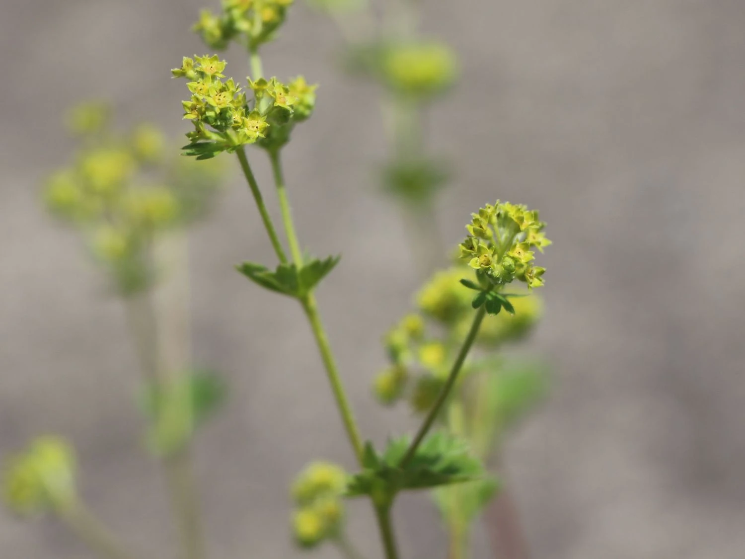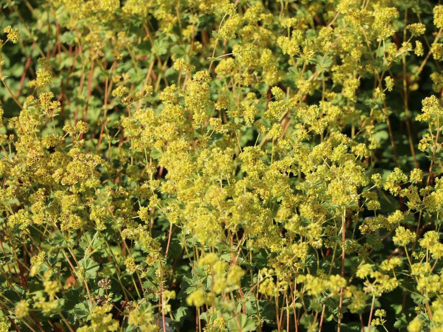Der Zwergige Frauenmantel ist der kleine Vertreter des Frauenmantels. Die Pflanze erreicht bis zu 30 Zentimeter Höhe und 15 bis 20 Zentimeter im Durchmesser. Alchemilla erythropoda wächst kissenartig. Das Besondere dieser ausdauernden Staude sind ihre handförmigen, gezähnten Blätter und die wunderschönen doldenförmigen Blütenstände. Zu den schönen Blättern und Blüten gesellen sich noch die roten Stiele. Die Blüten schmücken die Pflanze im Sommer von Juni bis in den Juli hinein. Das matte Blattwerk des Frauenmantels ist mittelgrün und hebt die gelblichen Blüten wunderschön hervor. Die Blätter haben den Lotuseffekt. Dabei perlt das Wasser von der Blattoberfläche ab und die einzelnen Tropfen glitzern zauberhaft im Sonnenschein! Trotz seiner geringen Größe, ist dieser Frauenmantel ein zierendes Element des Gartenbeets!